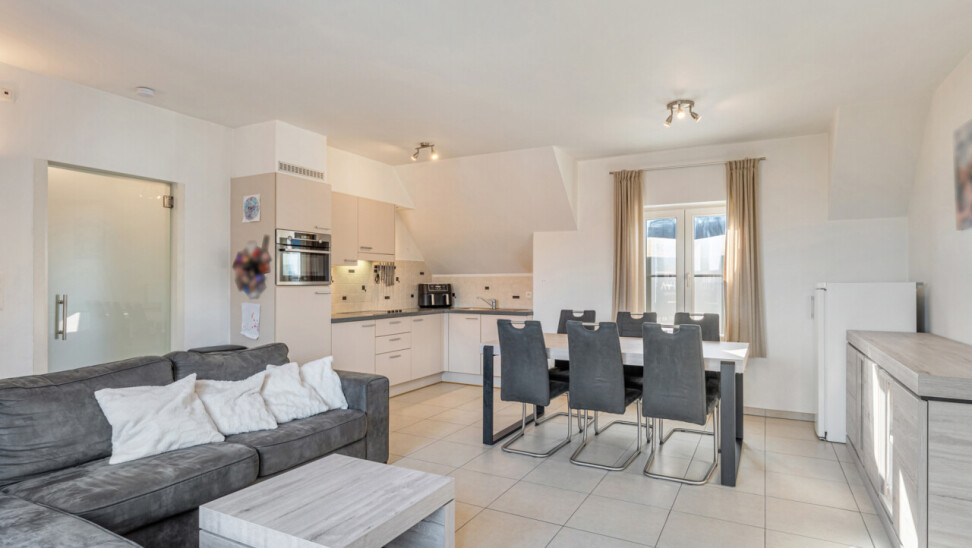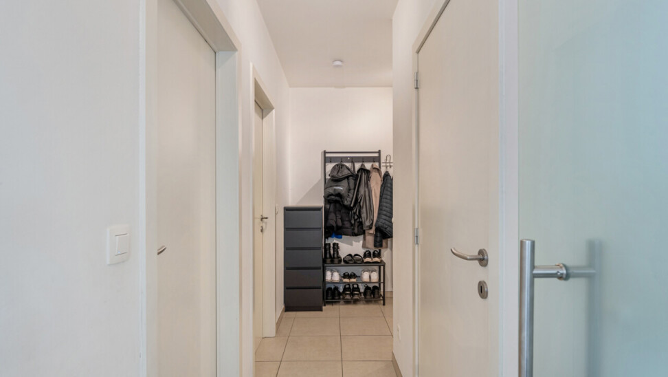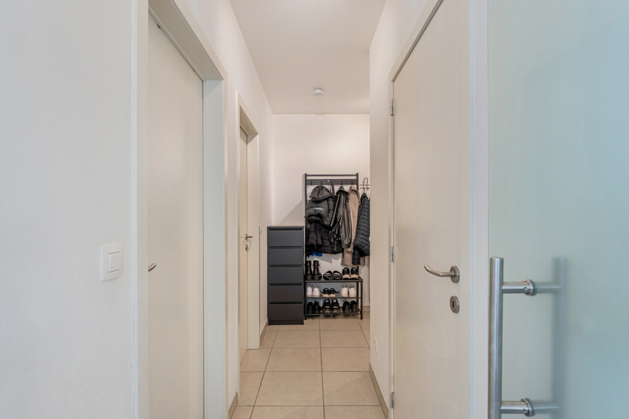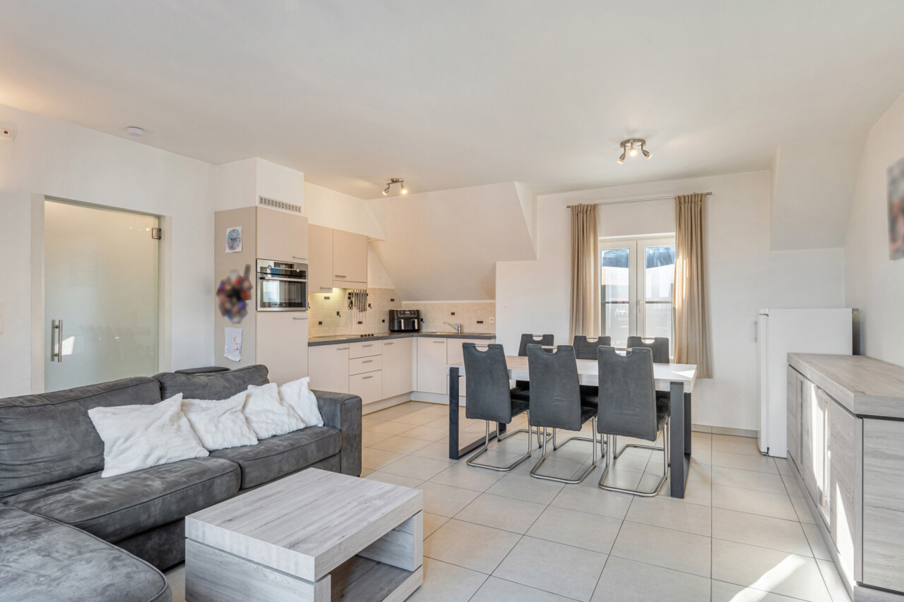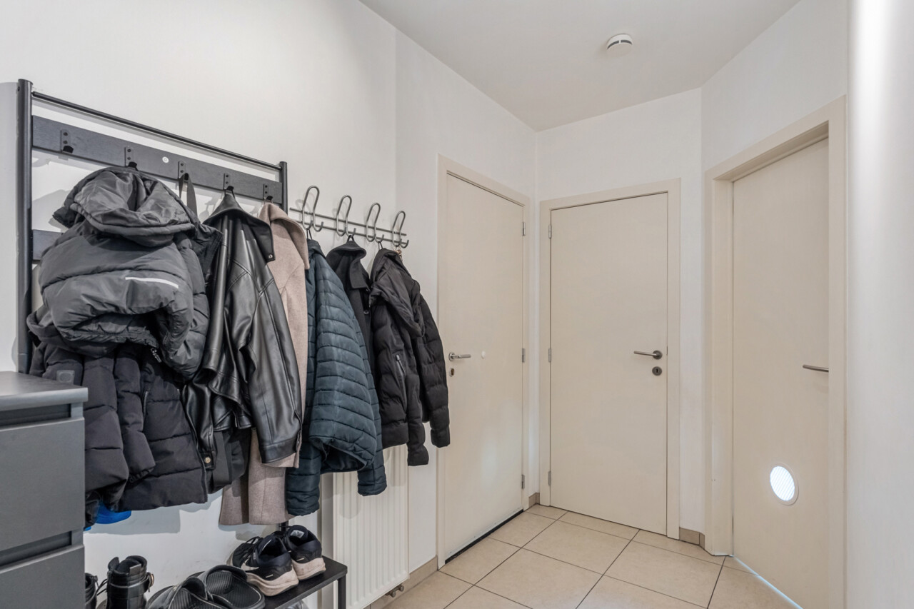 Via de inkomhal met apart toilet, lopen we door naar de lichtrijke leefruimte met zicht op het terras. De open keuken is volledig geïnstalleerd en beschikt over voldoende kastruimte.