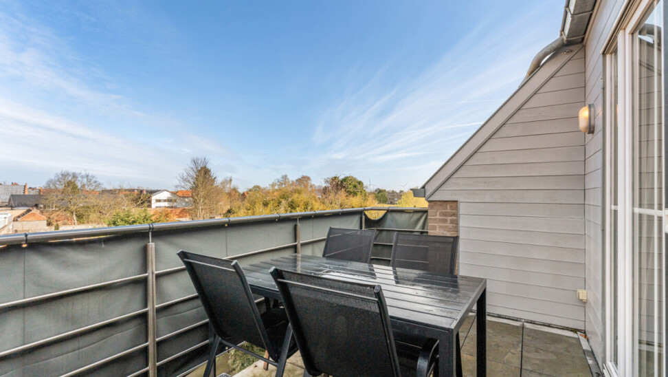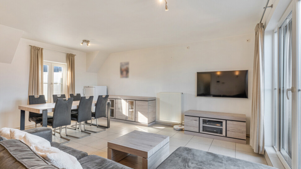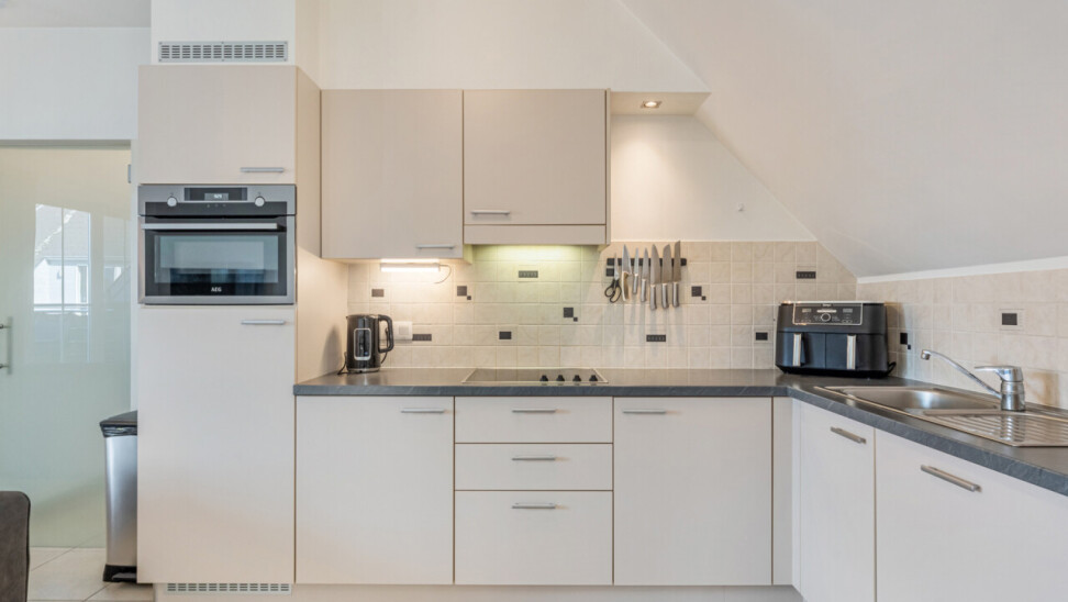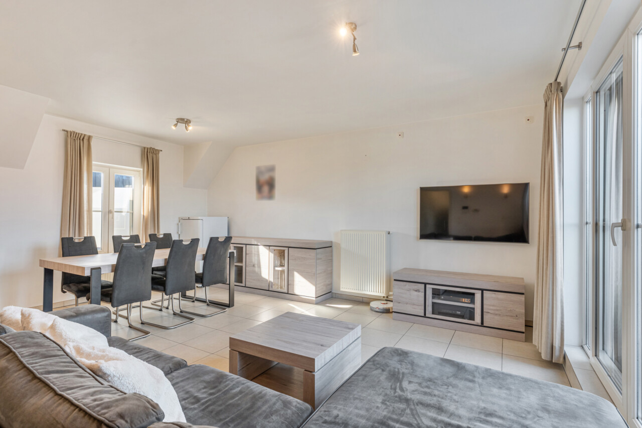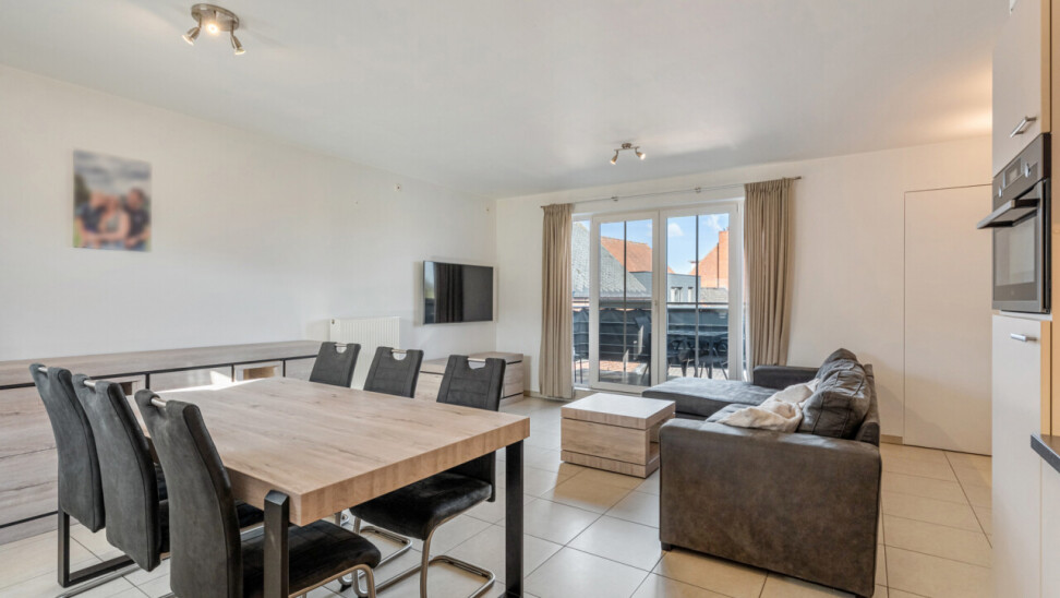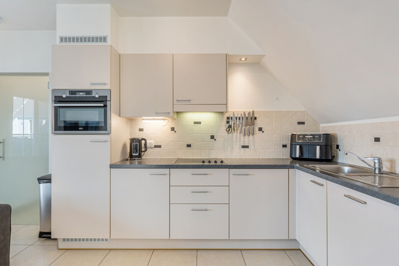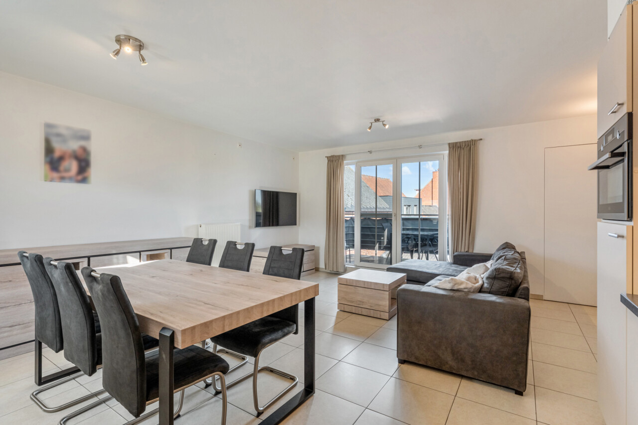 Via de inkomhal met apart toilet, lopen we door naar de lichtrijke leefruimte met zicht op het terras. De open keuken is volledig geïnstalleerd en beschikt over voldoende kastruimte.