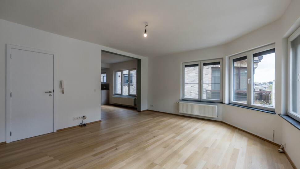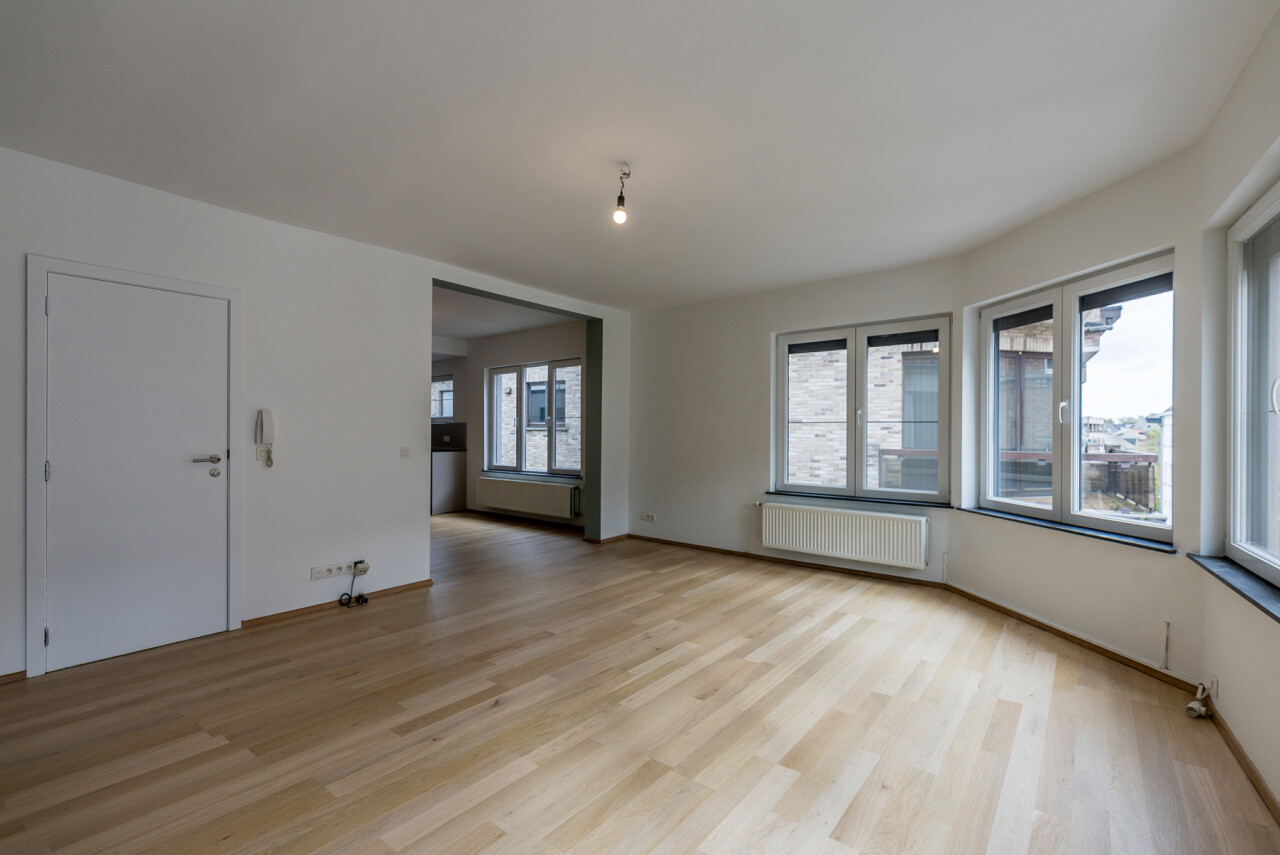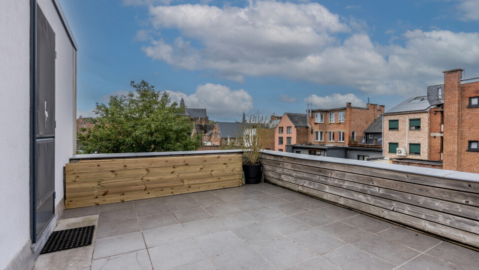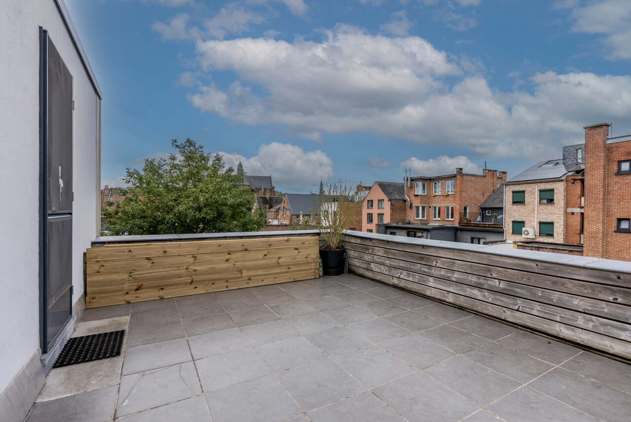 Het appartement bevindt zich op de 2e verdieping van een kleinschalig, gerenoveerd gebouw met slechts 3 appartementen. De indeling omvat een ruime, lichtrijke leefruimte met parket en aansluitende keuken, een recent vernieuwde badkamer met lavabo, douche en toilet, een slaapkamer en een ruim zongeoriënteerd terras met mooi verzicht. Op de bovenverdieping bevindt zich de tweede slaapkamer (± 30m²).