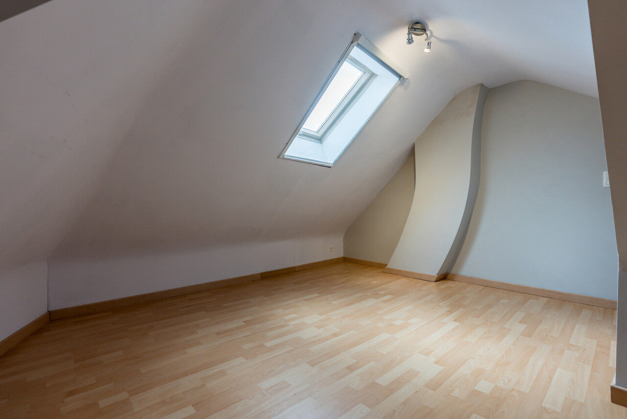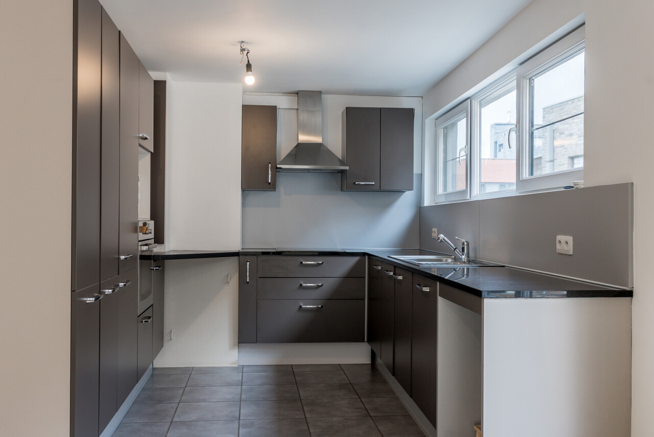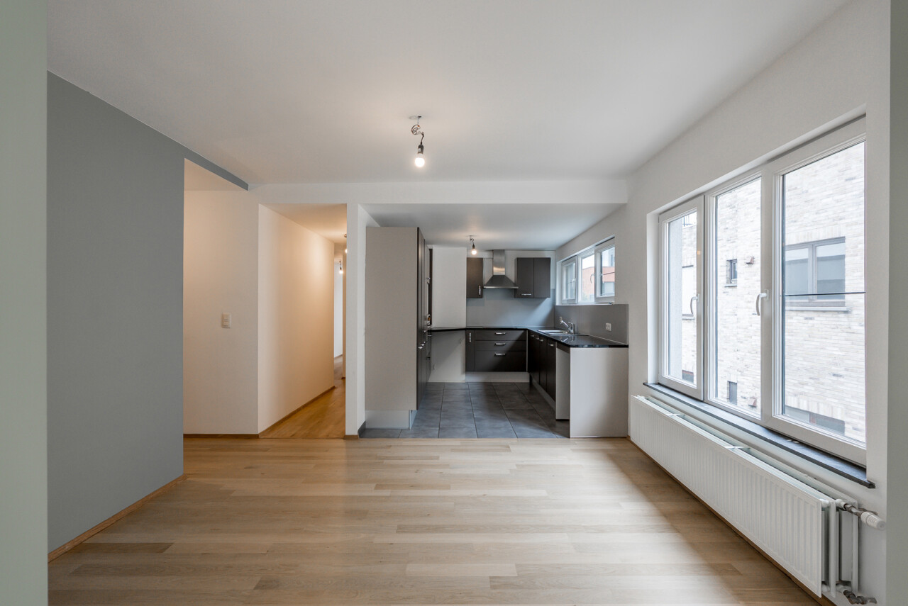 Het appartement bevindt zich op de 2e verdieping van een kleinschalig, gerenoveerd gebouw met slechts 3 appartementen. De indeling omvat een ruime, lichtrijke leefruimte met parket en aansluitende keuken, een recent vernieuwde badkamer met lavabo, douche en toilet, een slaapkamer en een ruim zongeoriënteerd terras met mooi verzicht. Op de bovenverdieping bevindt zich de tweede slaapkamer (± 30m²).