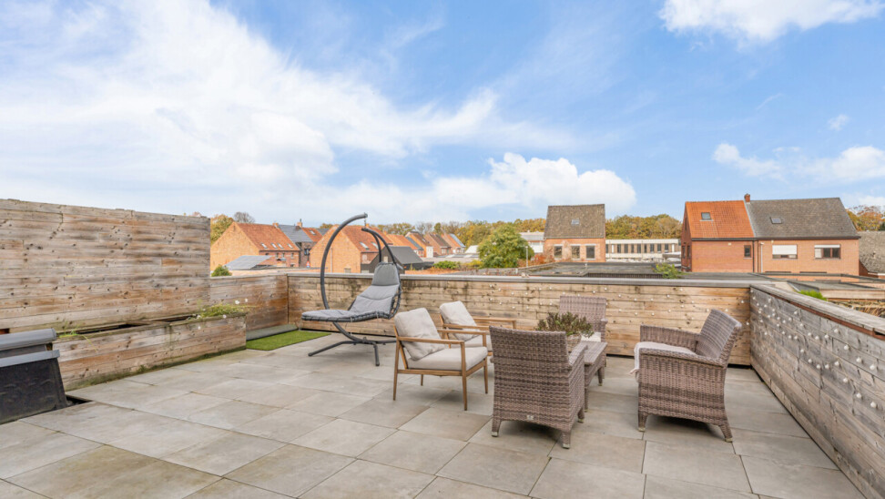 Het gelijkvloers omvat een inkomhal met berging en de trap naar het eerste verdiep. Op de eerste verdieping bevinden zich een apart toilet, een ruime en lichtrijke leefruimte met glazen inkomdeur, en een open, volledig ingerichte keuken voorzien van alle comfort (oven, combi-oven, vaatwasser, inductiekookplaat, koelkast, …). Verder is er nog een praktische berging en een zonnig terras van maar liefst 50 m².