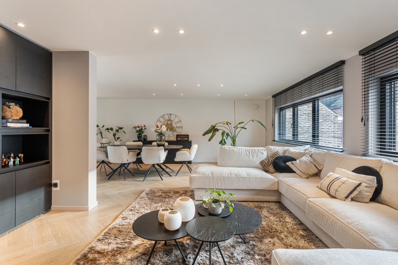Het gelijkvloers omvat een inkomhal met berging en de trap naar het eerste verdiep. Op de eerste verdieping bevinden zich een apart toilet, een ruime en lichtrijke leefruimte met glazen inkomdeur, en een open, volledig ingerichte keuken voorzien van alle comfort (oven, combi-oven, vaatwasser, inductiekookplaat, koelkast, …). Verder is er nog een praktische berging en een zonnig terras van maar liefst 50 m².