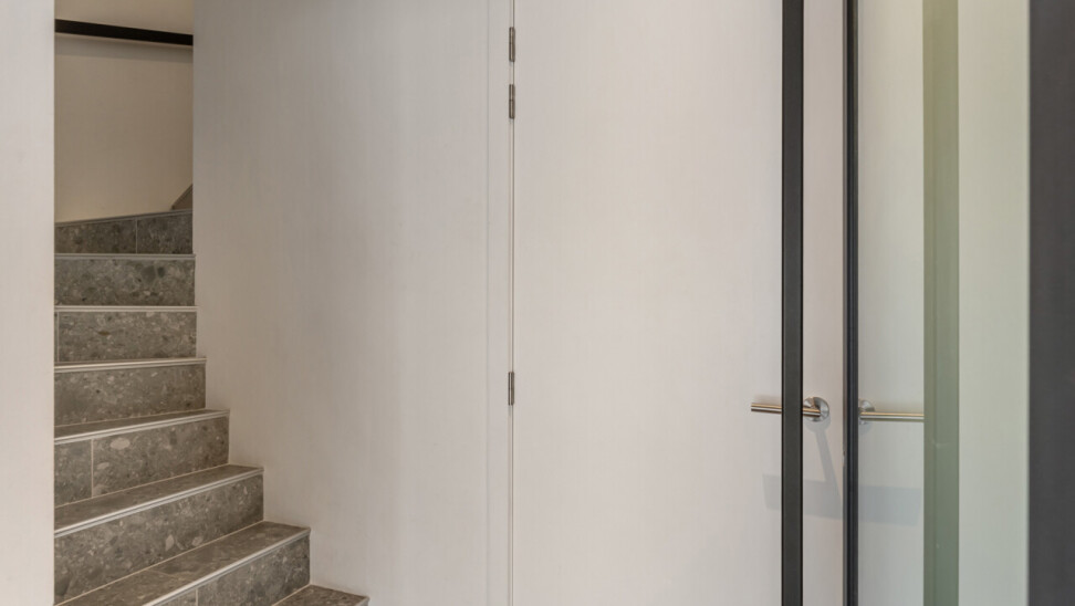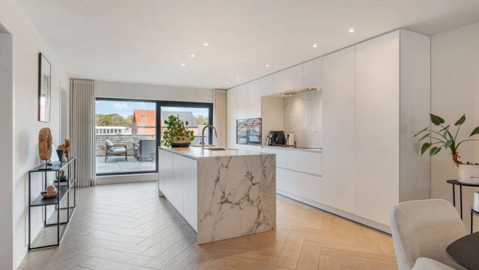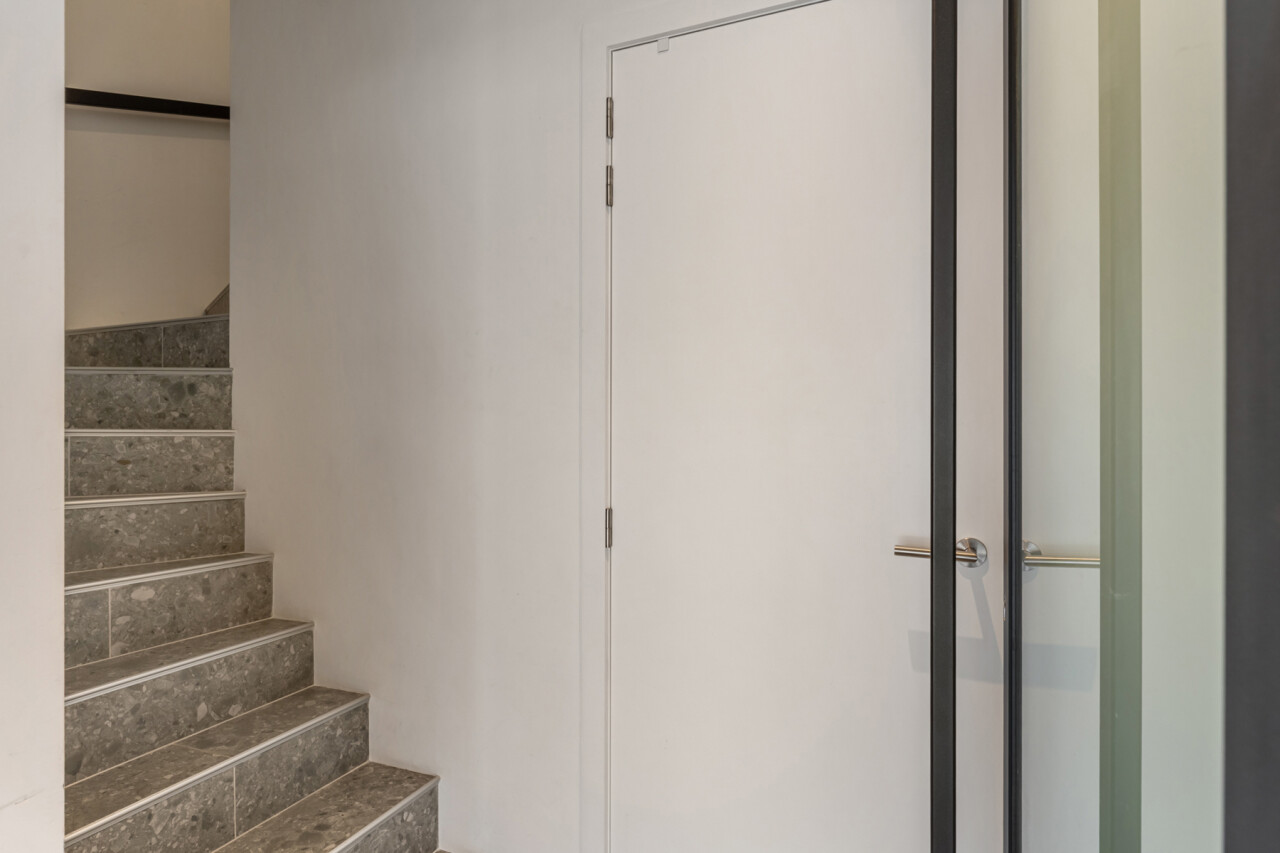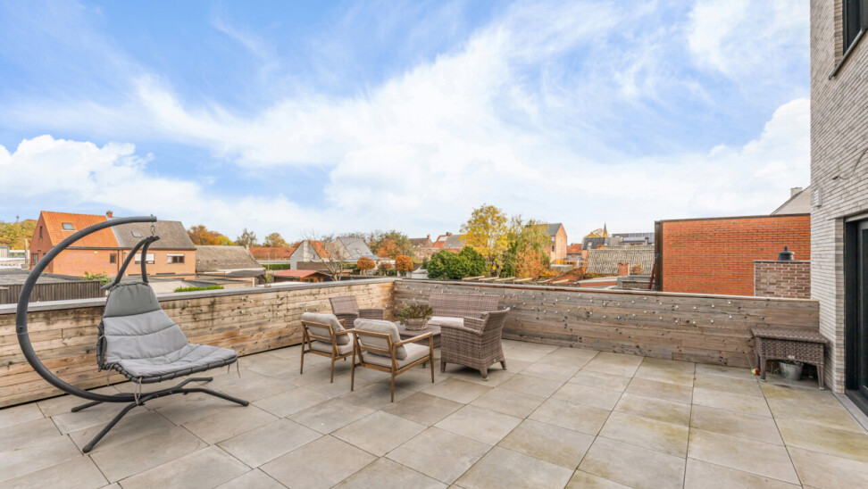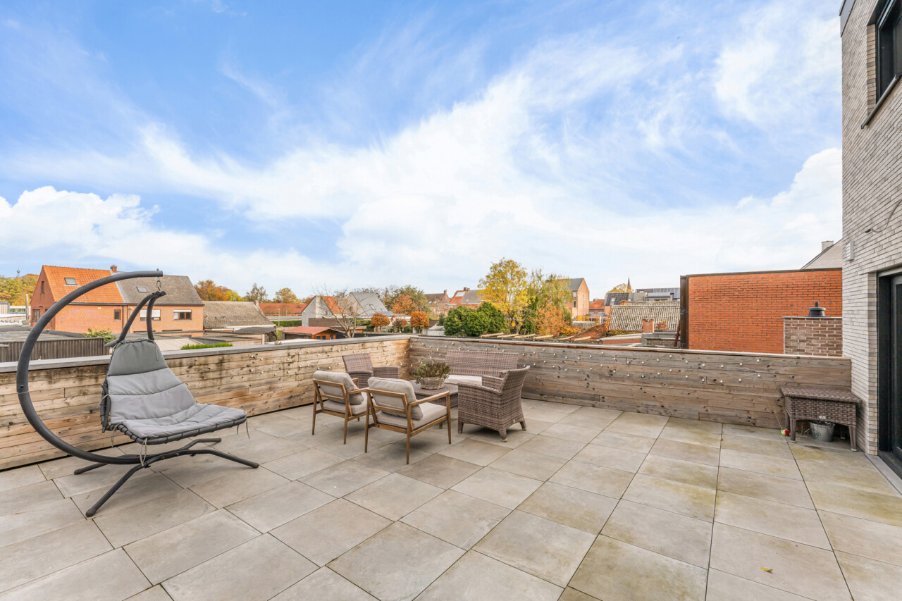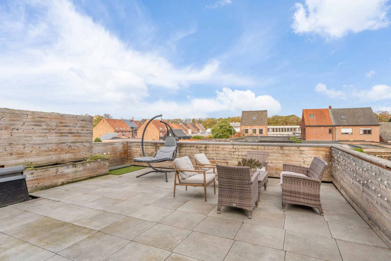 Het gelijkvloers omvat een inkomhal met berging en de trap naar het eerste verdiep. Op de eerste verdieping bevinden zich een apart toilet, een ruime en lichtrijke leefruimte met glazen inkomdeur, en een open, volledig ingerichte keuken voorzien van alle comfort (oven, combi-oven, vaatwasser, inductiekookplaat, koelkast, …). Verder is er nog een praktische berging en een zonnig terras van maar liefst 50 m².