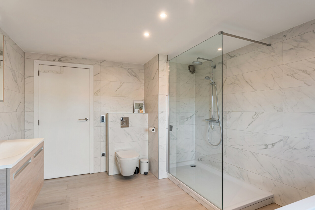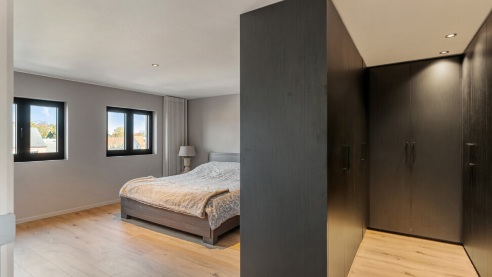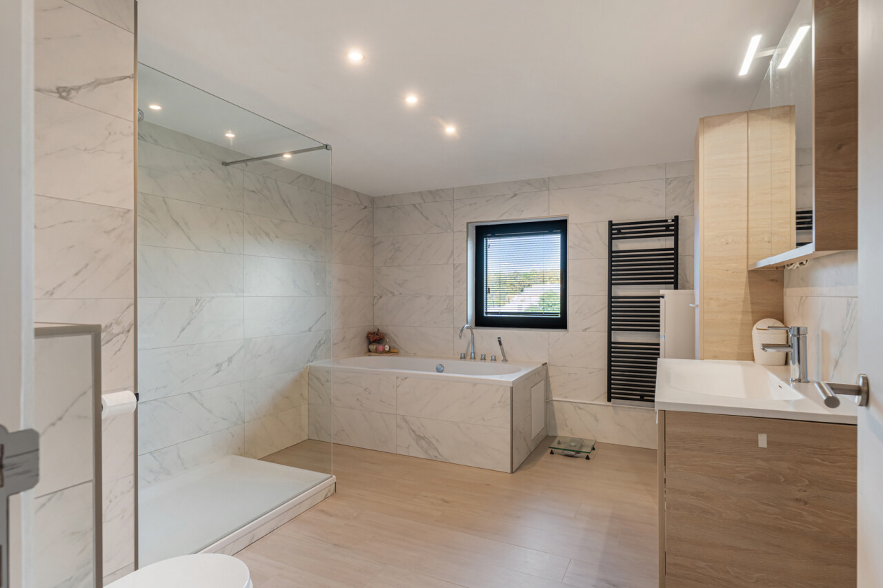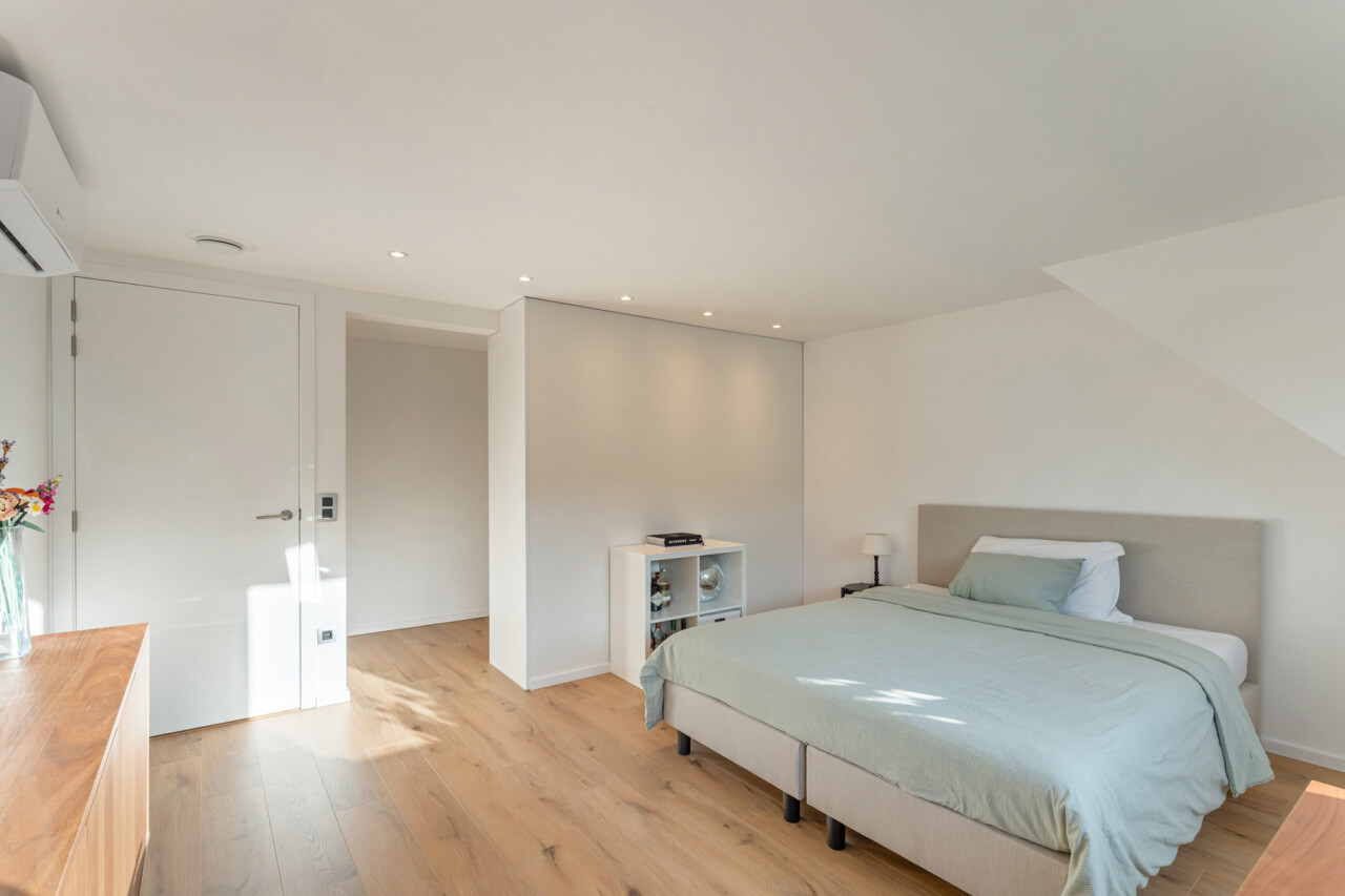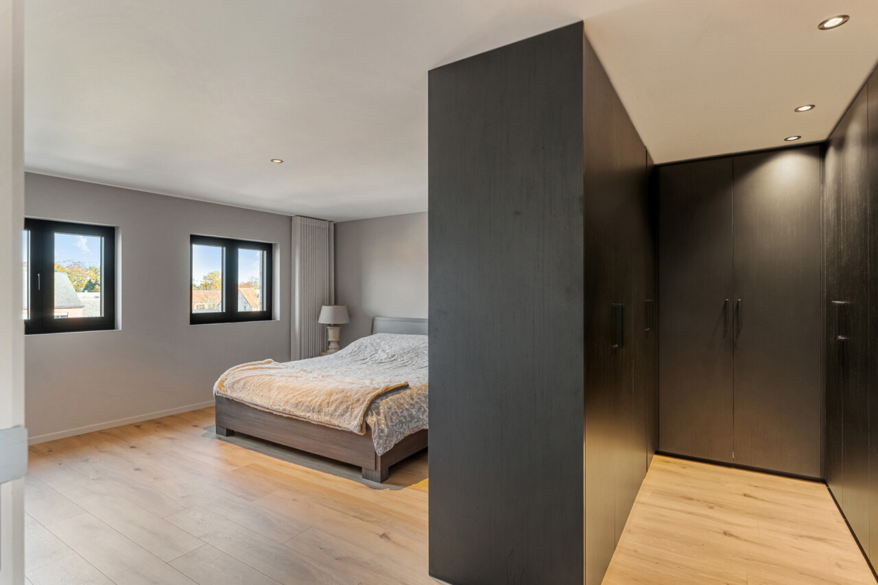 Op de tweede verdieping vinden we drie slaapkamers, waarvan elk met eigen dressing. De moderne badkamer beschikt over een grote inloopdouche, ligbad, toilet en lavabo. Daarnaast is er nog een zolder aanwezig.