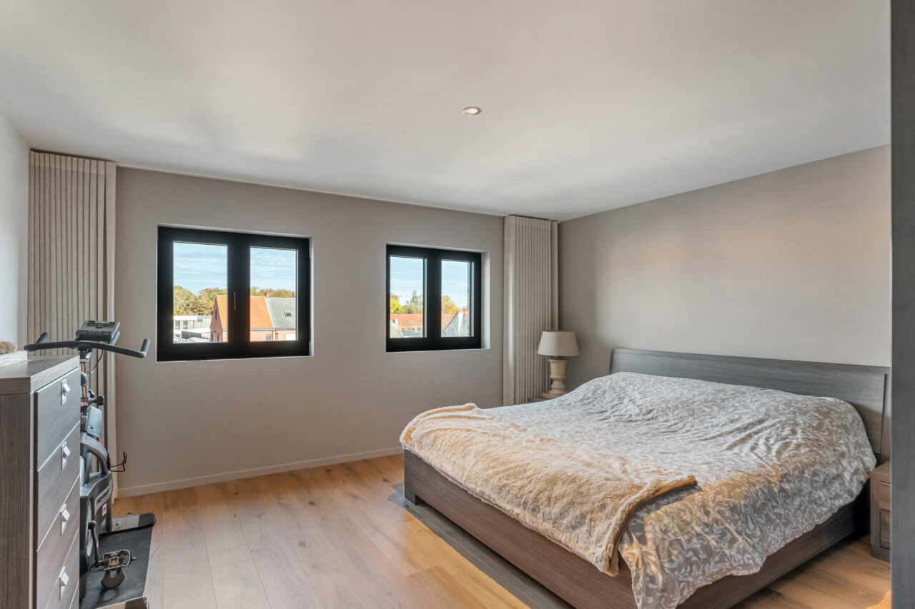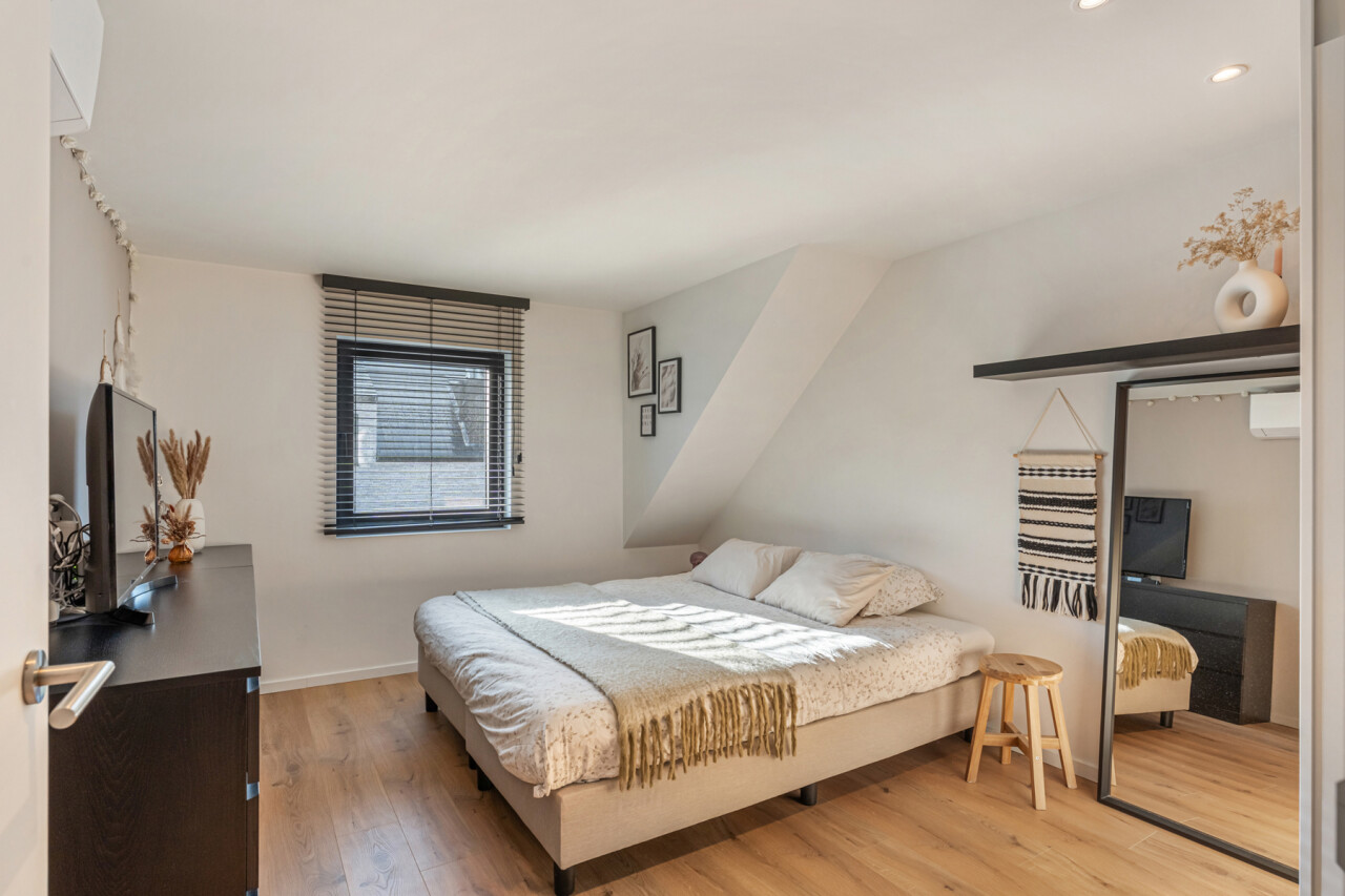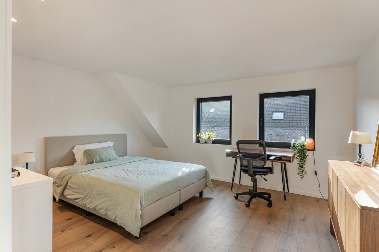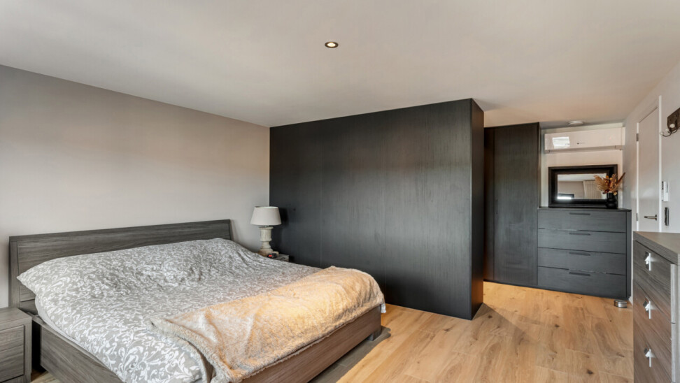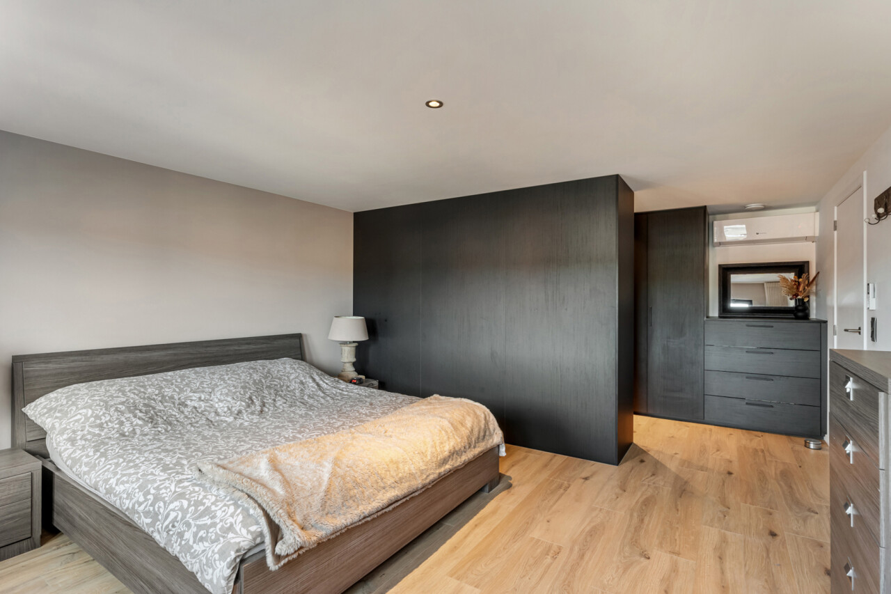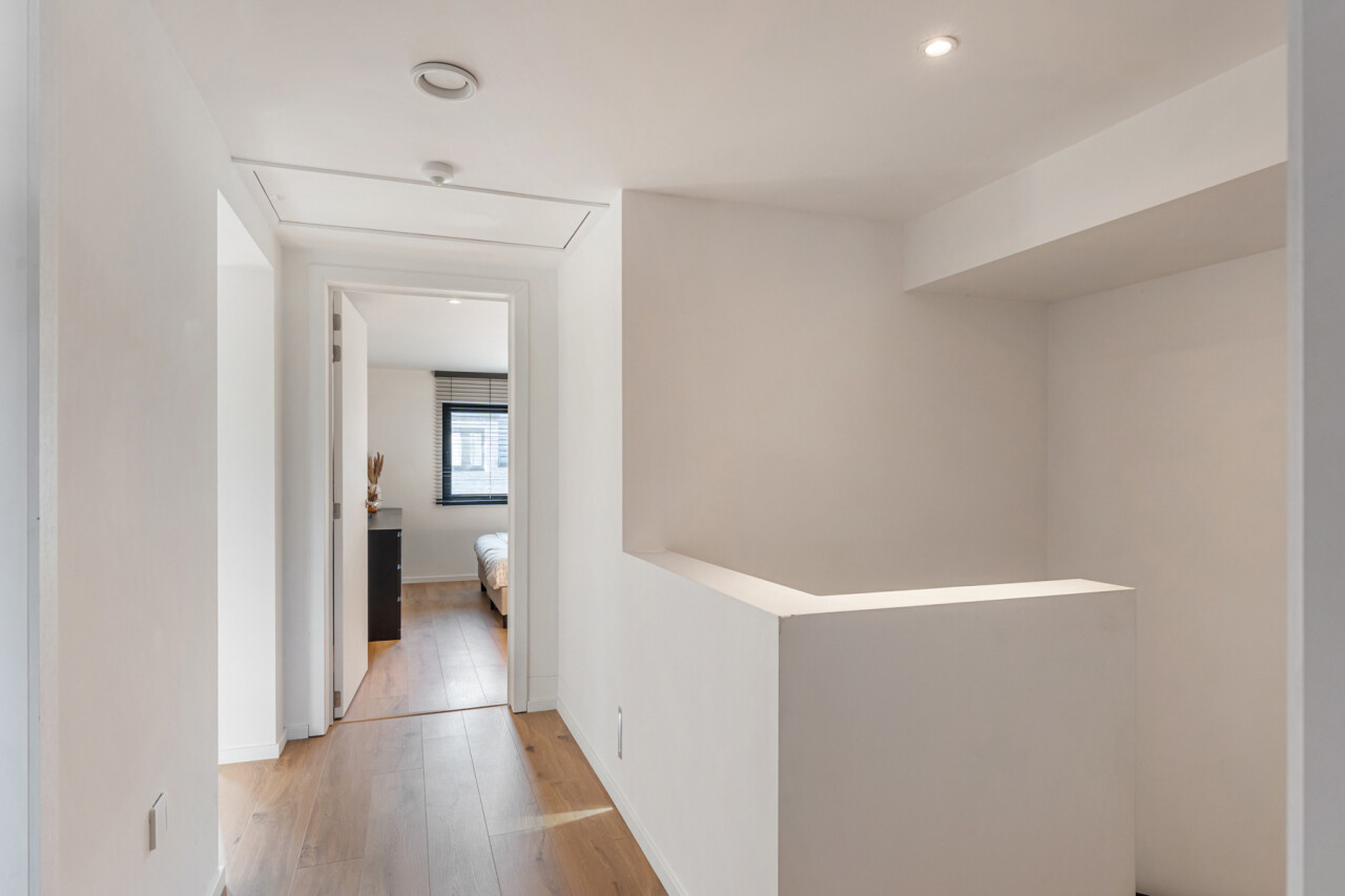 Op de tweede verdieping vinden we drie slaapkamers, waarvan elk met eigen dressing. De moderne badkamer beschikt over een grote inloopdouche, ligbad, toilet en lavabo. Daarnaast is er nog een zolder aanwezig.