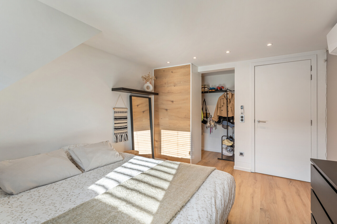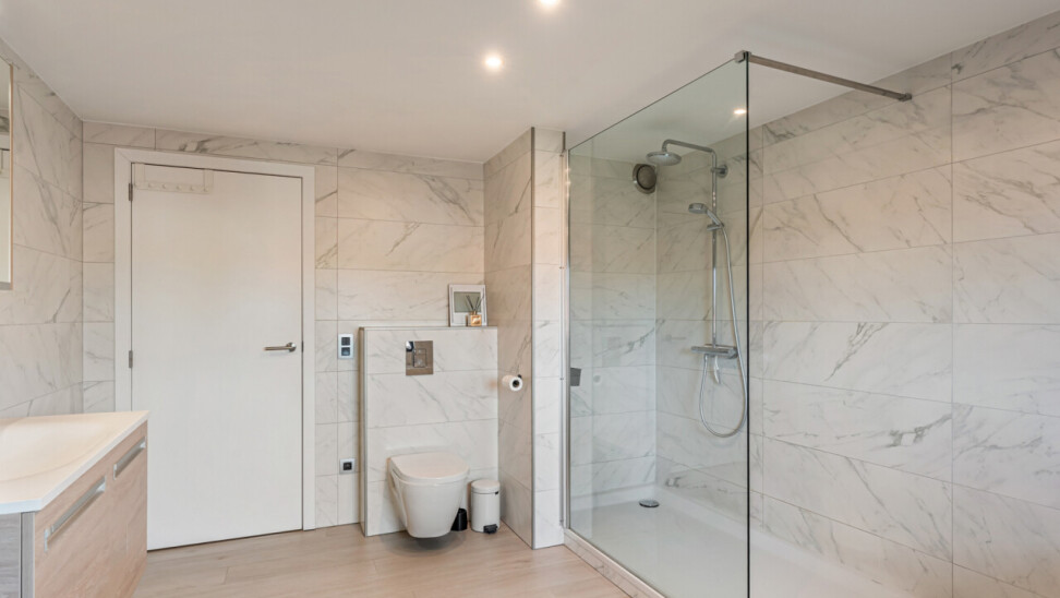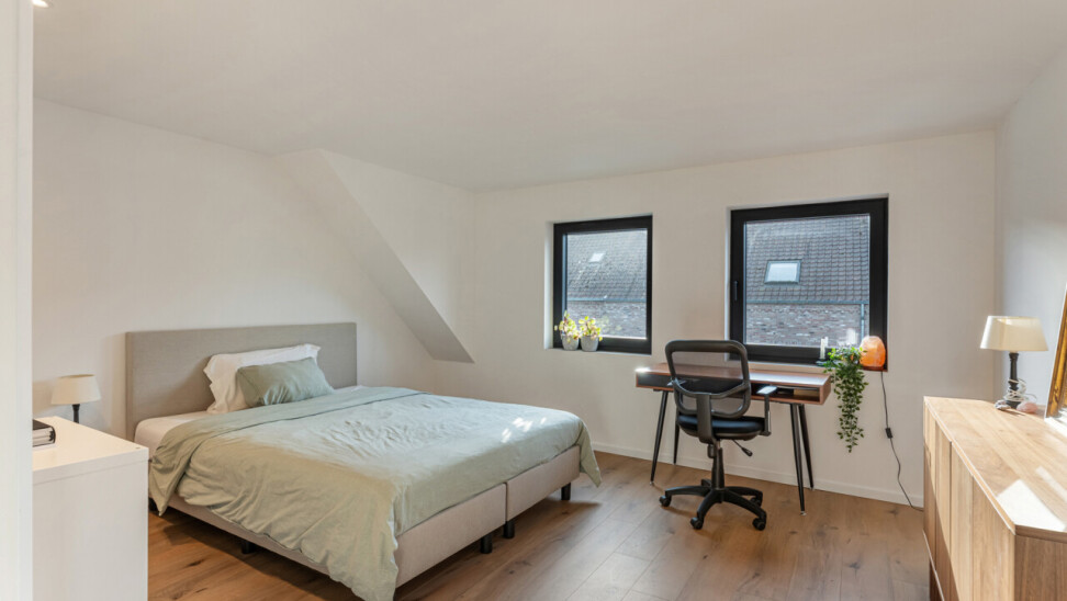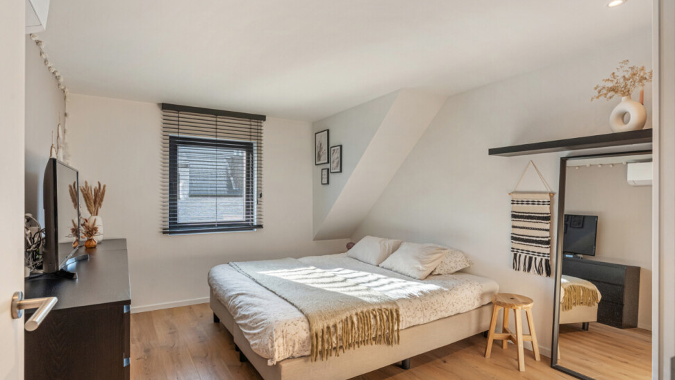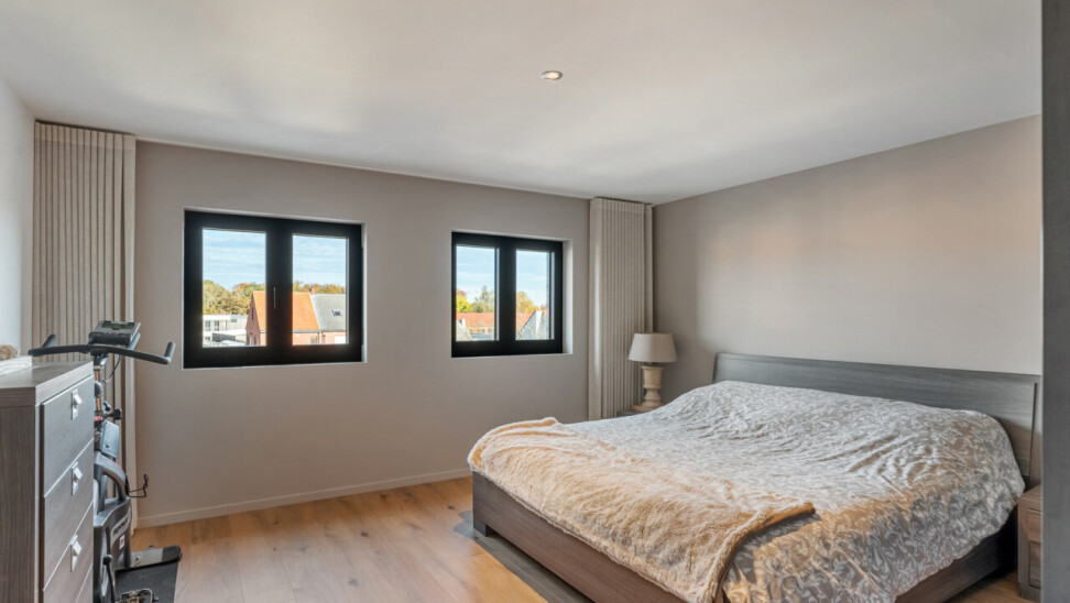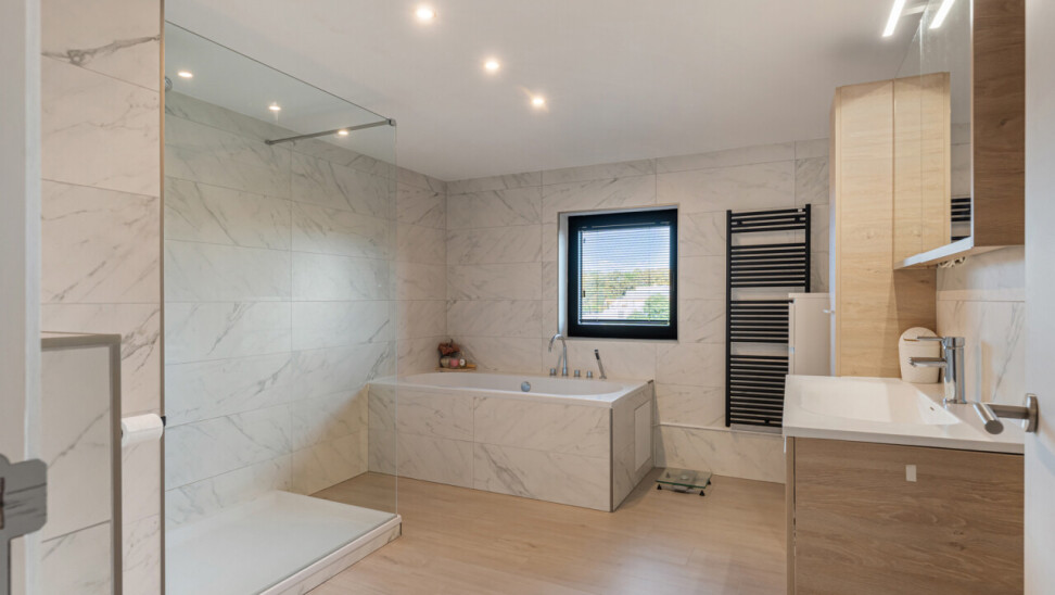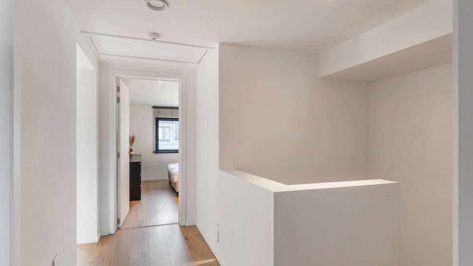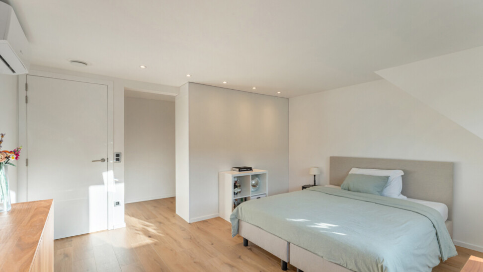 Op de tweede verdieping vinden we drie slaapkamers, waarvan elk met eigen dressing. De moderne badkamer beschikt over een grote inloopdouche, ligbad, toilet en lavabo. Daarnaast is er nog een zolder aanwezig.