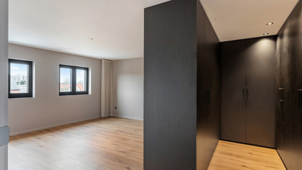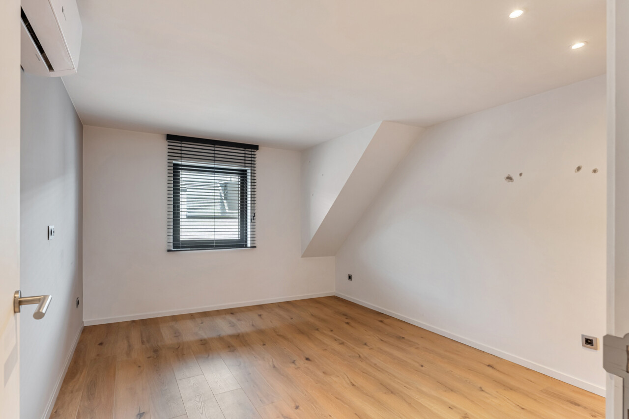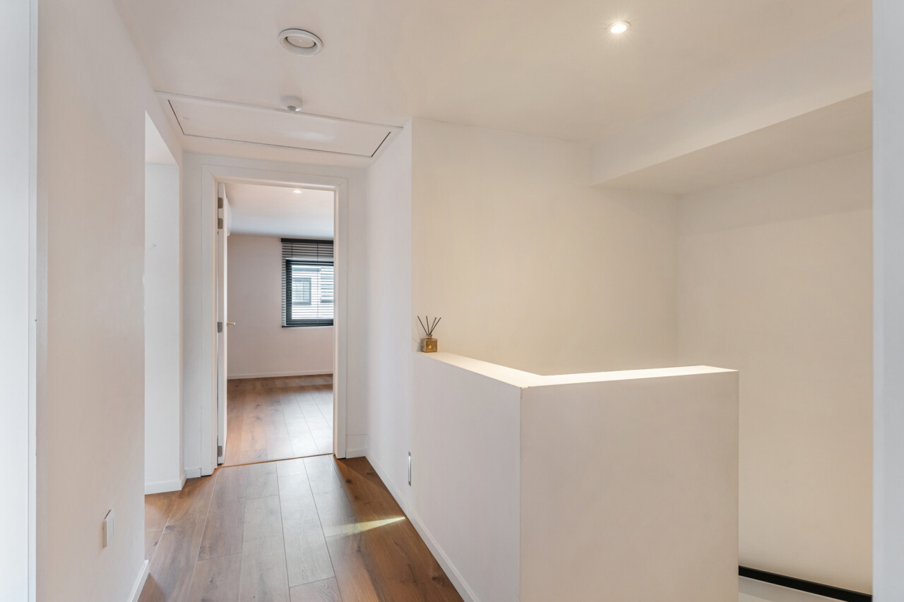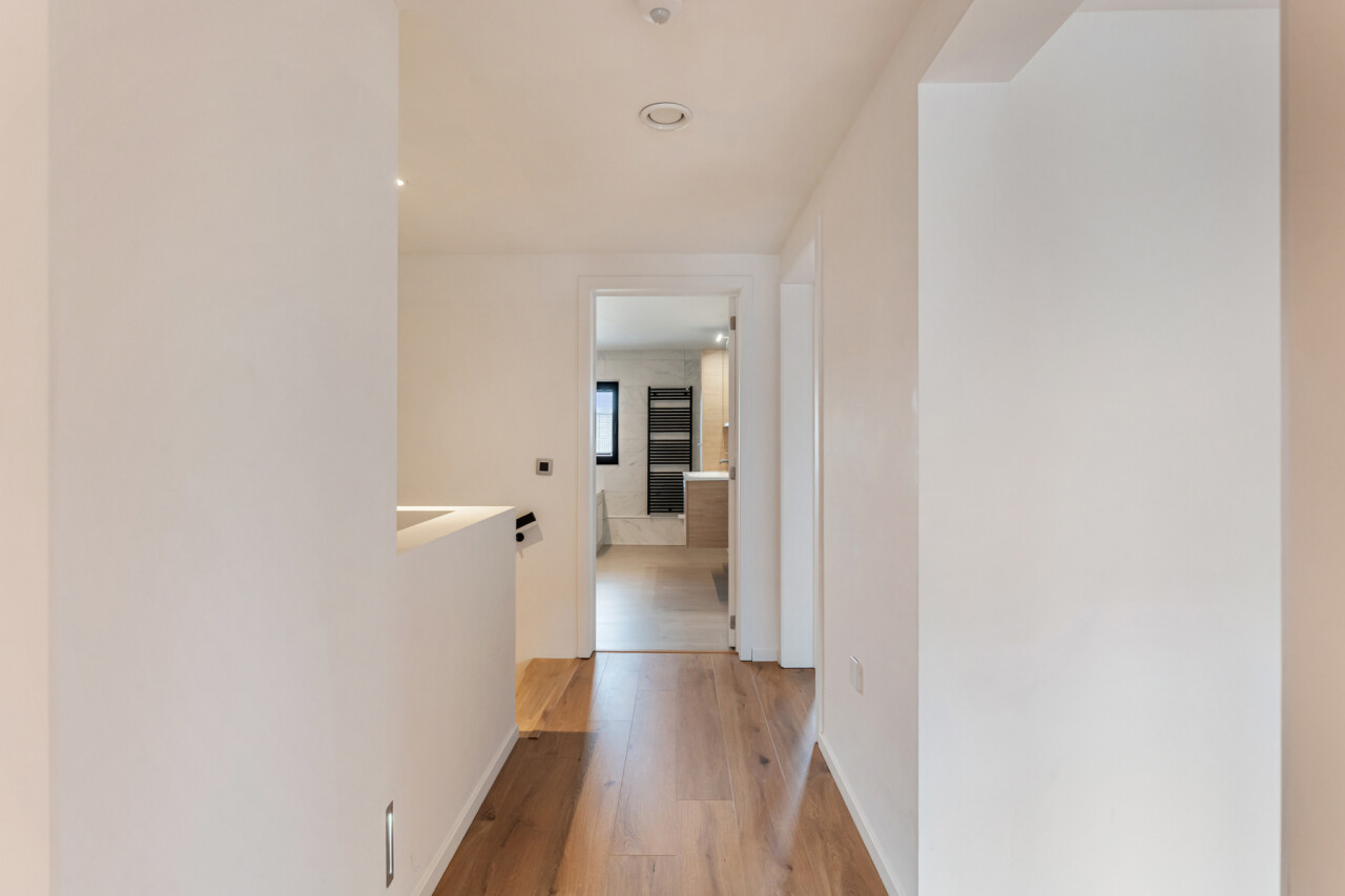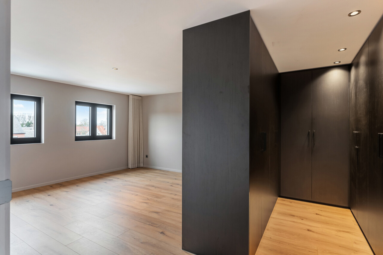Op de tweede verdieping vinden we drie slaapkamers, waarvan elk met eigen dressing. De moderne badkamer beschikt over een grote inloopdouche, ligbad, toilet en lavabo. Daarnaast is er nog een zolder aanwezig.