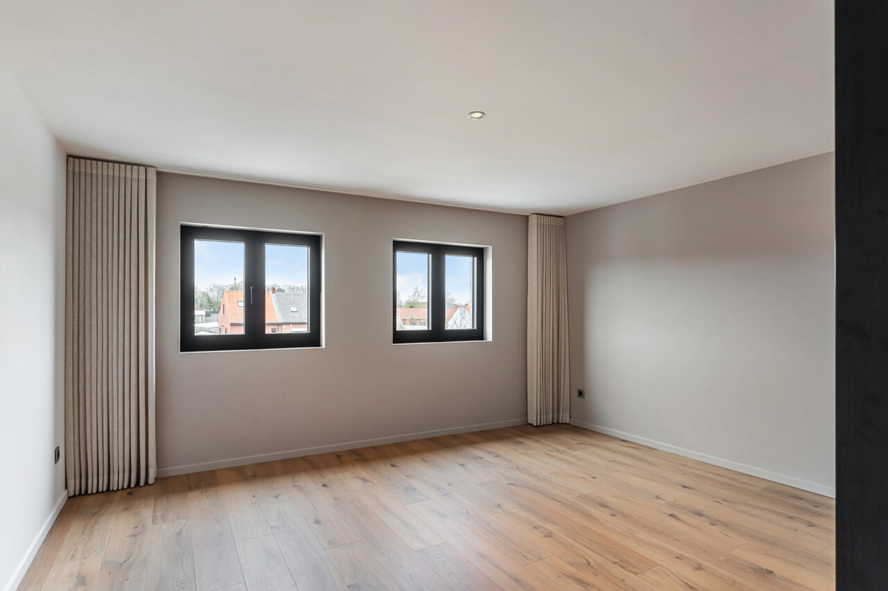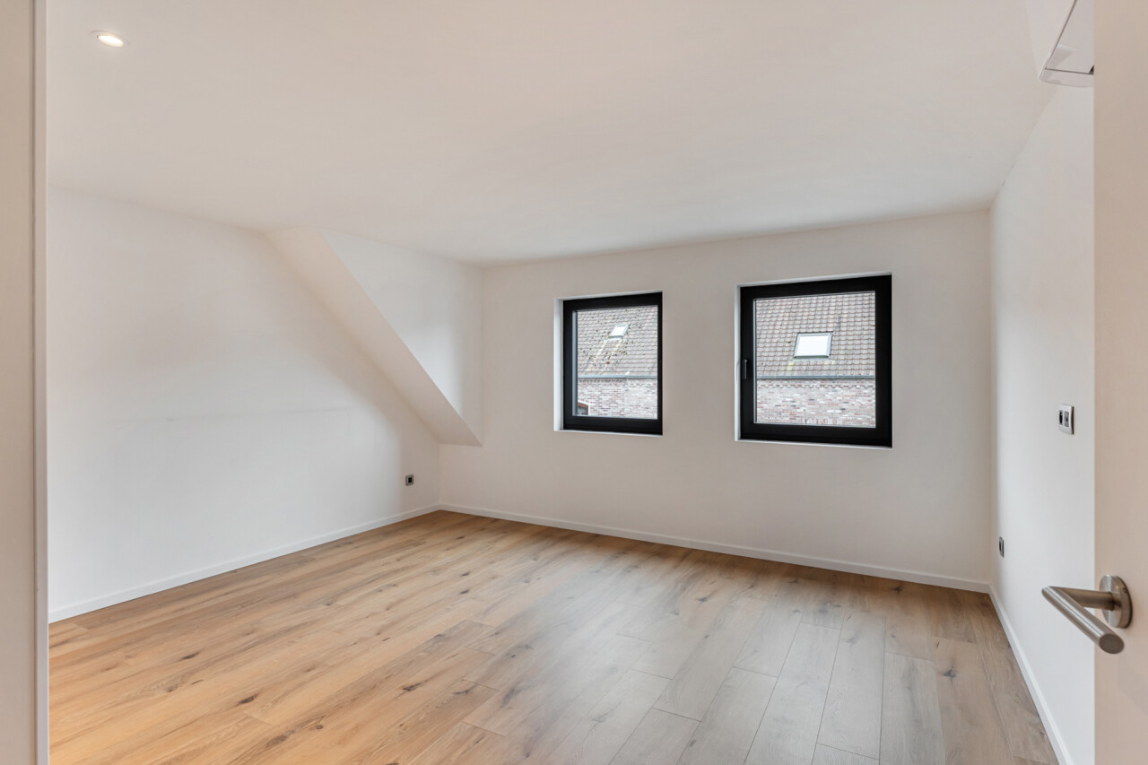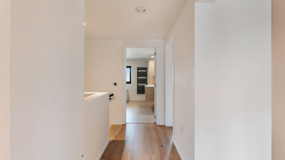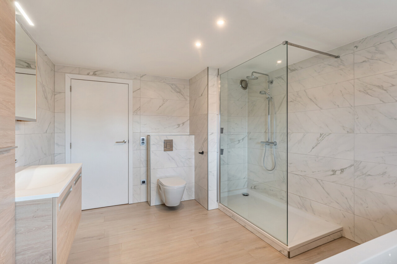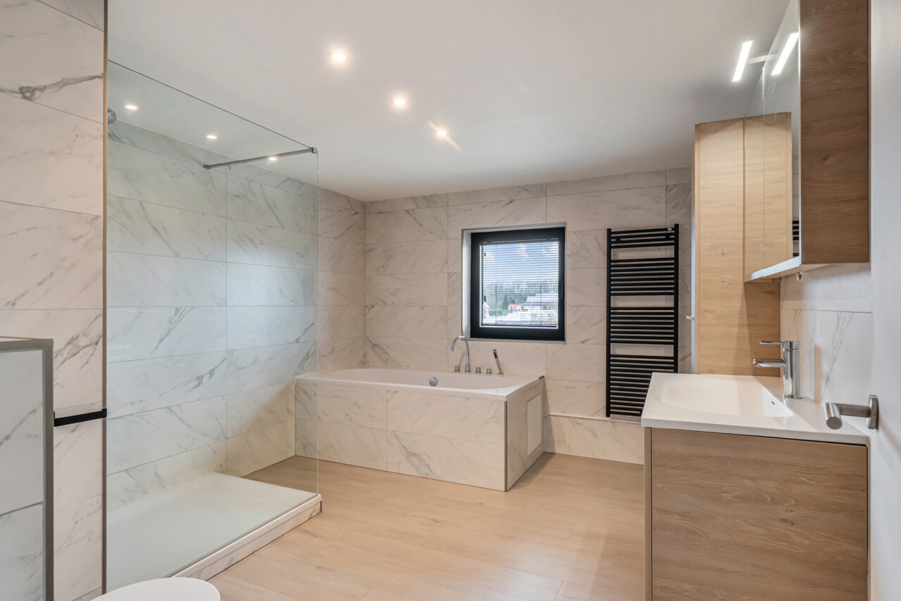 Op de tweede verdieping vinden we drie slaapkamers, waarvan elk met eigen dressing. De moderne badkamer beschikt over een grote inloopdouche, ligbad, toilet en lavabo. Daarnaast is er nog een zolder aanwezig.