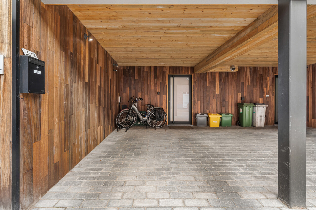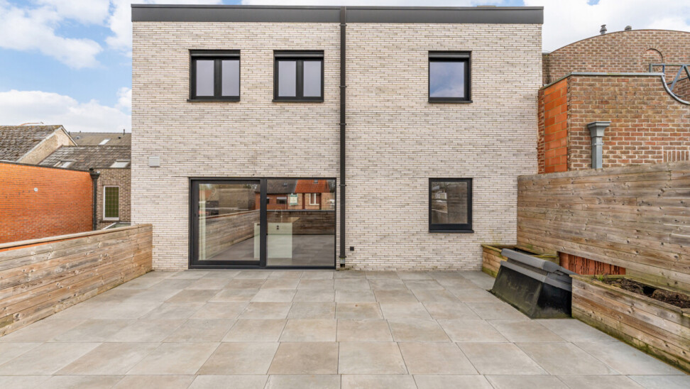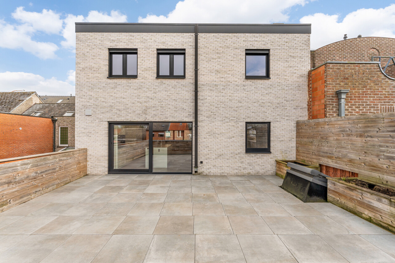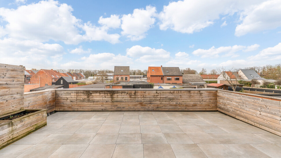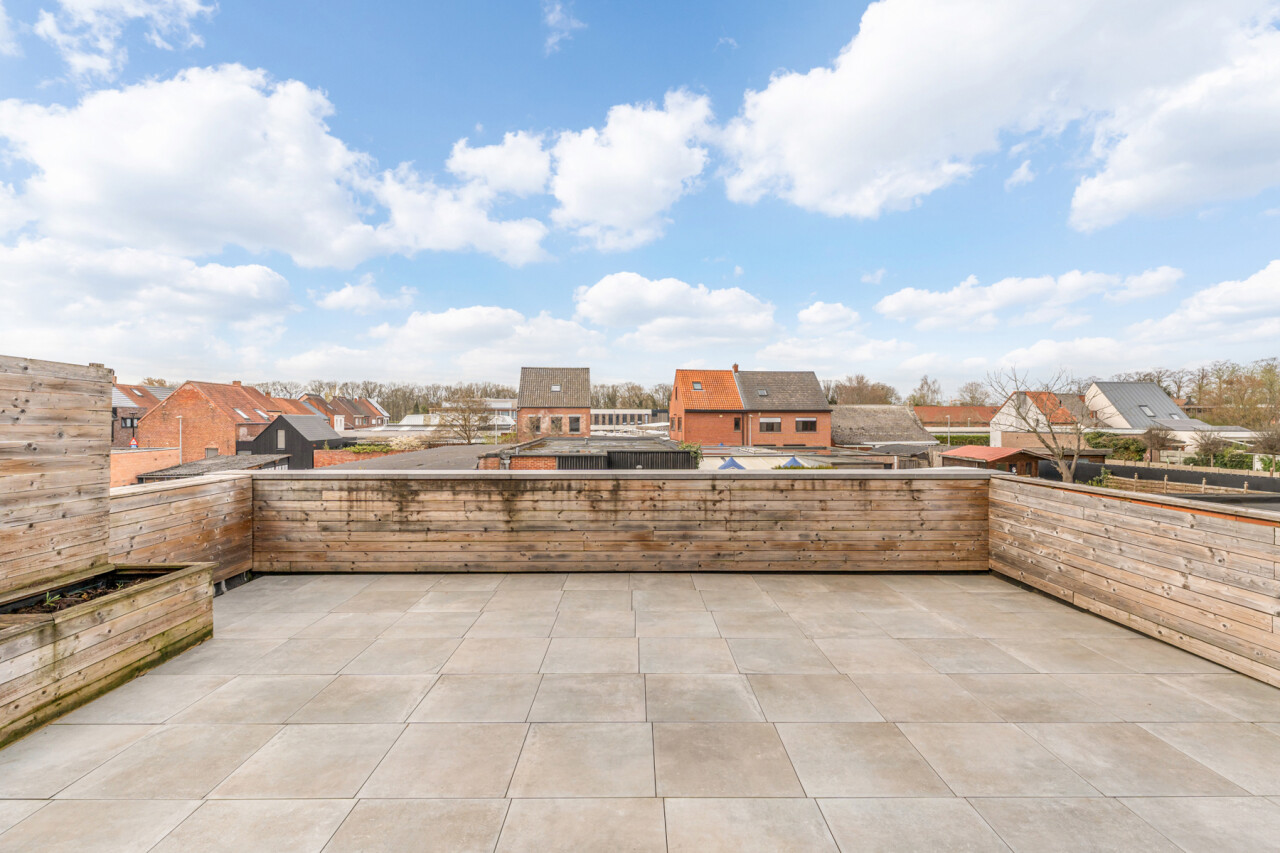 Het gelijkvloers omvat een inkomhal met berging en de trap naar het eerste verdiep. Op de eerste verdieping bevinden zich een apart toilet, een ruime en lichtrijke leefruimte met glazen inkomdeur, en een open, volledig ingerichte keuken voorzien van alle comfort (oven, combi-oven, vaatwasser, inductiekookplaat, koelkast, …). Verder is er nog een praktische berging en een zonnig terras van maar liefst 50 m².