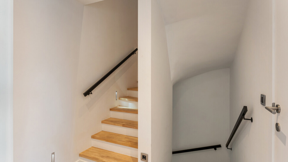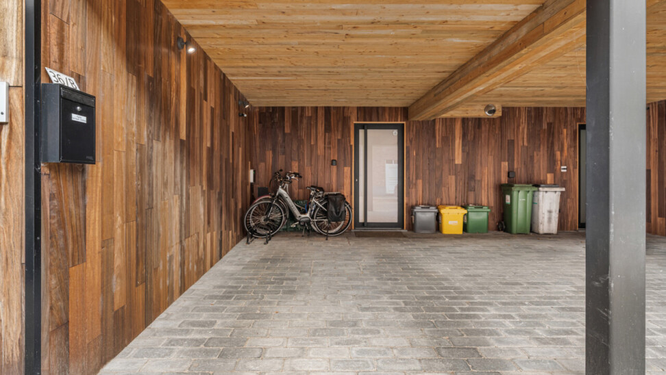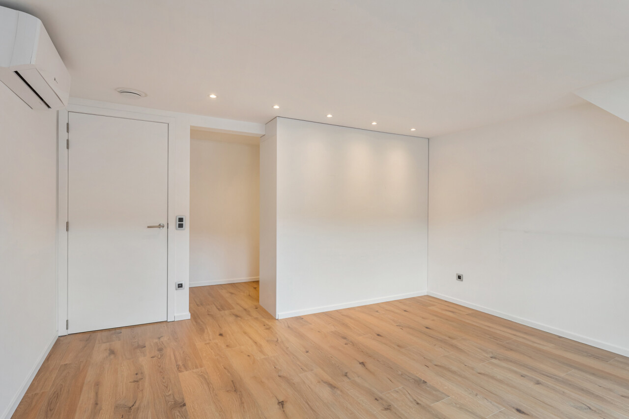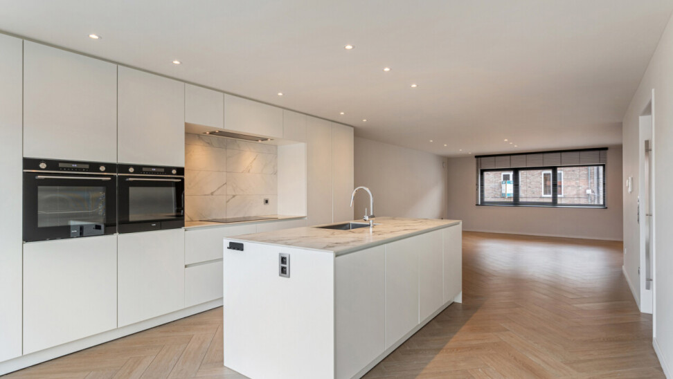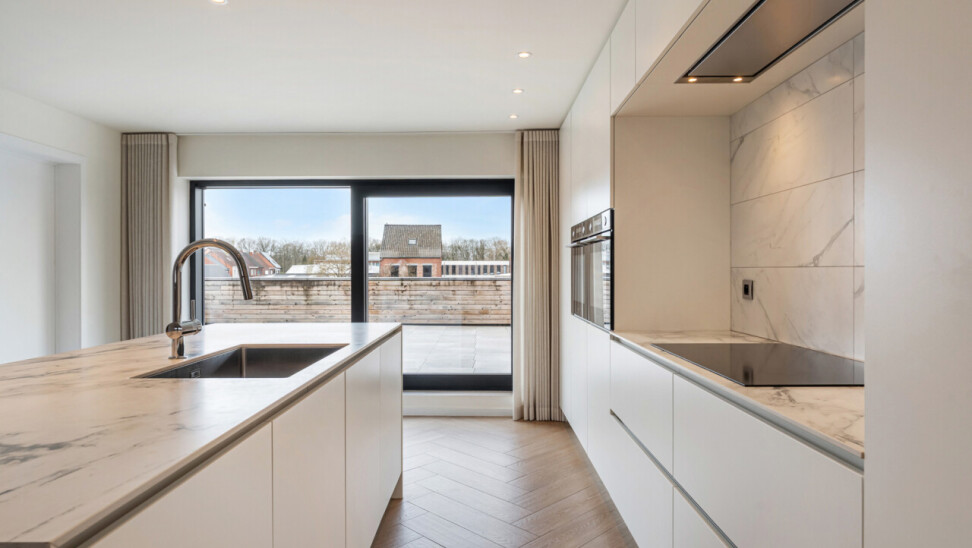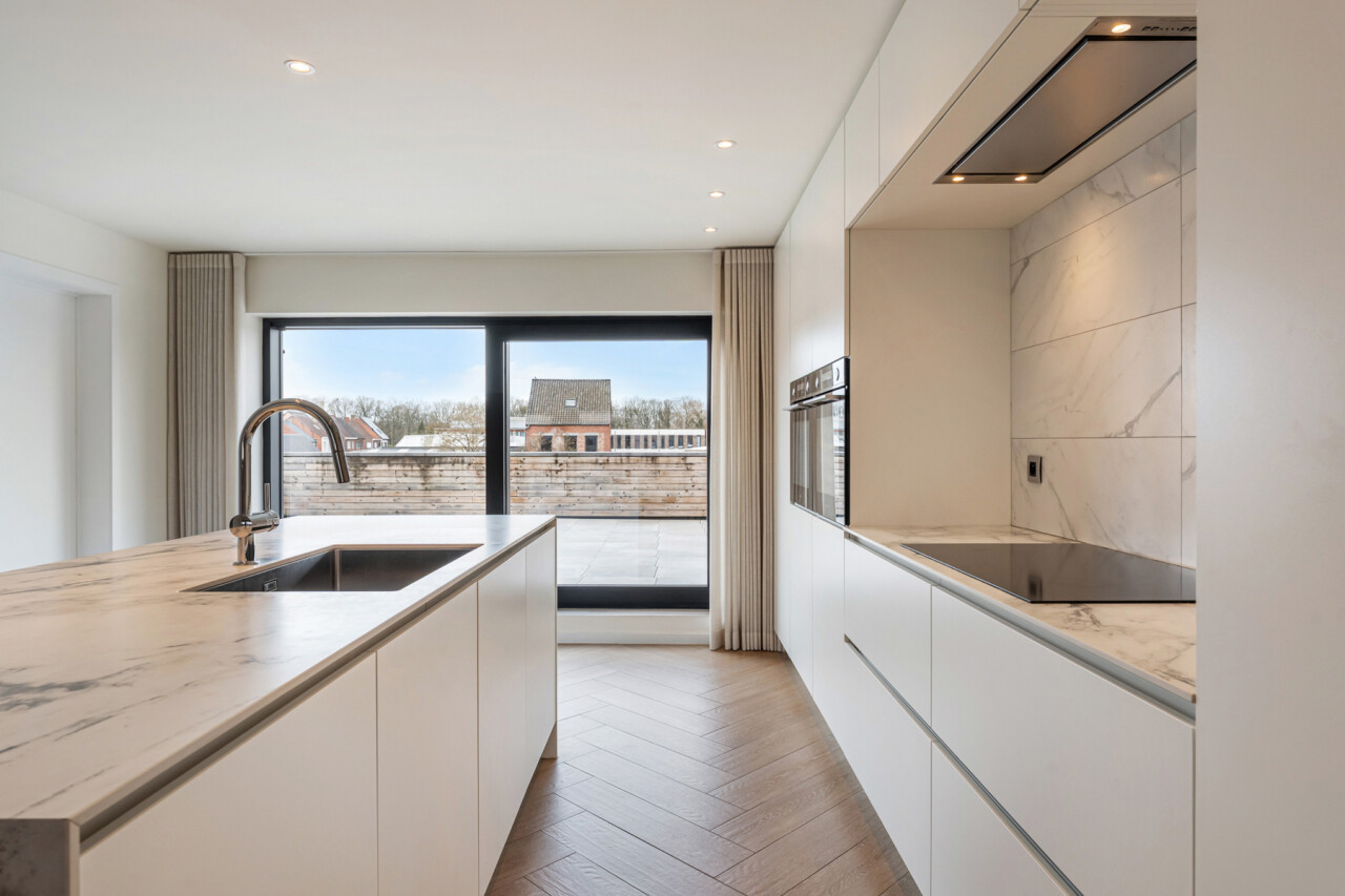 Het gelijkvloers omvat een inkomhal met berging en de trap naar het eerste verdiep. Op de eerste verdieping bevinden zich een apart toilet, een ruime en lichtrijke leefruimte met glazen inkomdeur, en een open, volledig ingerichte keuken voorzien van alle comfort (oven, combi-oven, vaatwasser, inductiekookplaat, koelkast, …). Verder is er nog een praktische berging en een zonnig terras van maar liefst 50 m².