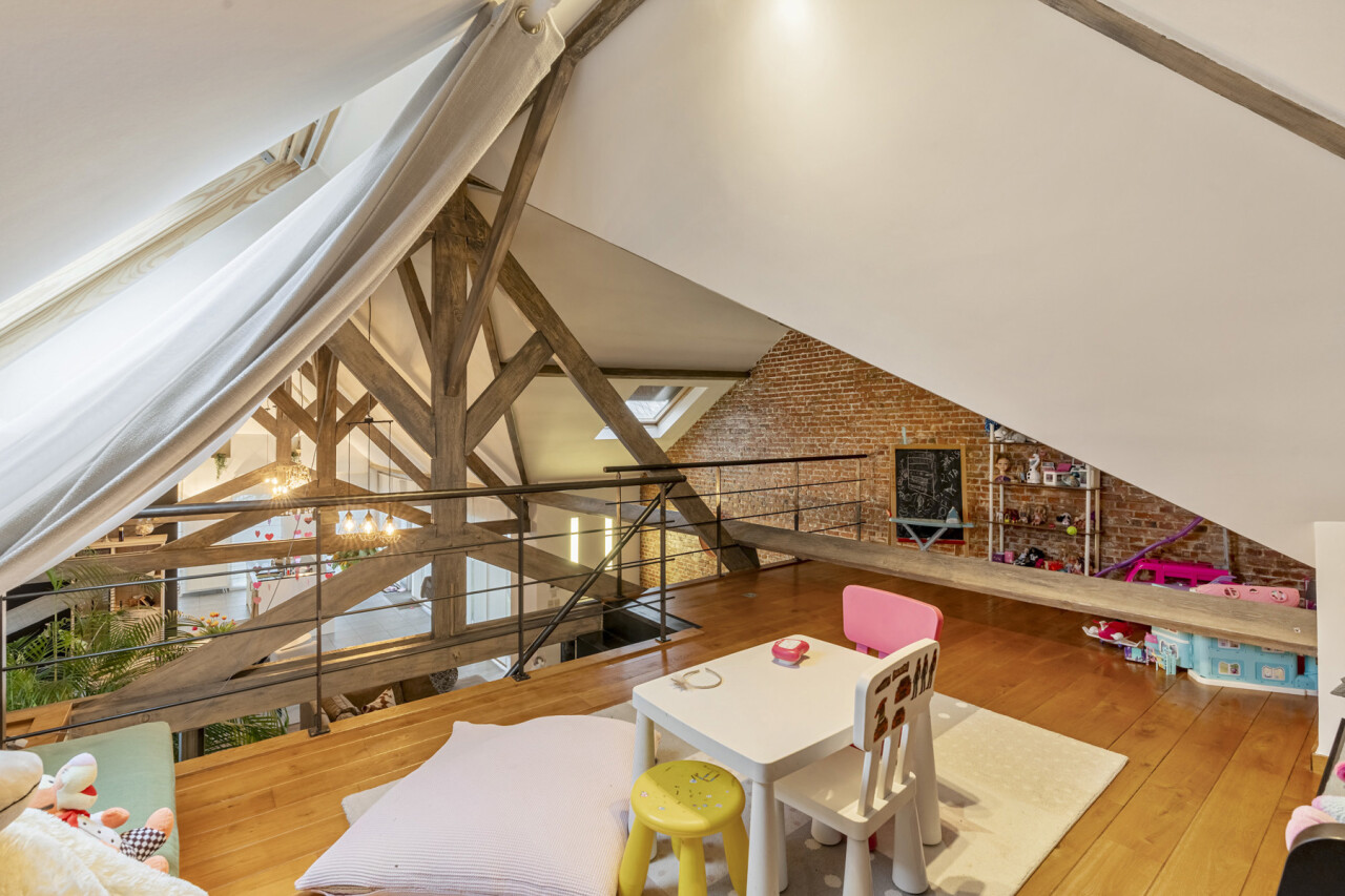 Dit handelshuis beschikt over een ruime commerciële gelijkvloerse verdieping. Voorzien van verschillende bureau/atelierruimtes, berging, keuken , toilet en een kelder. Zeer aangenaam is het zicht op de tuin achteraan. De bovenverdieping een prachtige woonst, een appartement met 3 slaapkamers en 3 badkamers. Het appartement heeft een eigen toegang, en een bijzonder ruim terras van ca. 60 m². Volledig geïnstalleerde keuken en een ruime woonkamer.