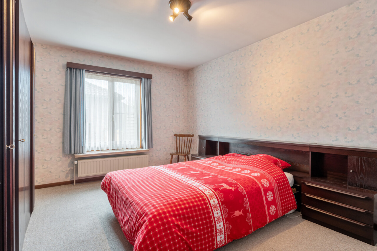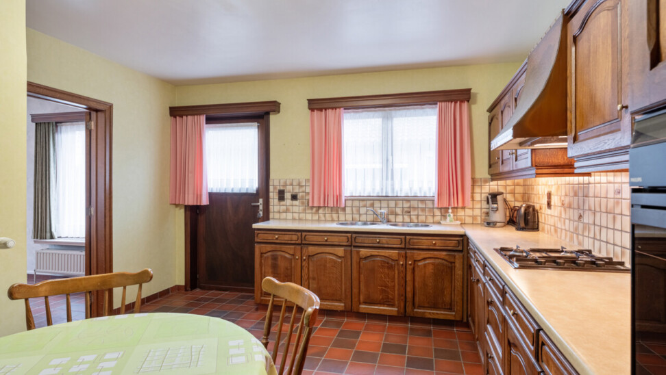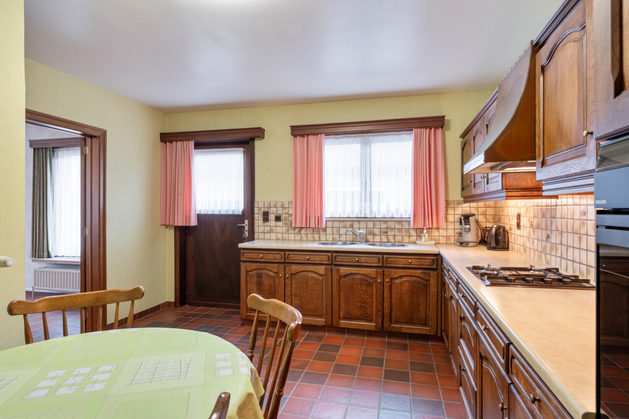 Deze gelijkvloerse woning is zeer goed onderhouden. De inkomhal omvat een apart toilet en ruimte voor een vestiaire. De lichtrijke woonkamer sluit aan op de keuken. De volledig geïnstalleerde keuken is uitgerust met een spoelbak, dampkap, koelkast en een volwaardige oven.