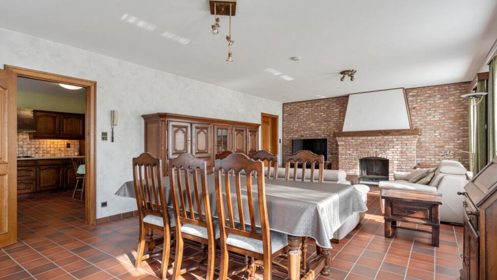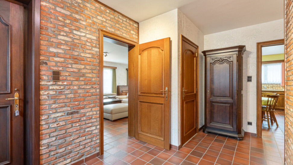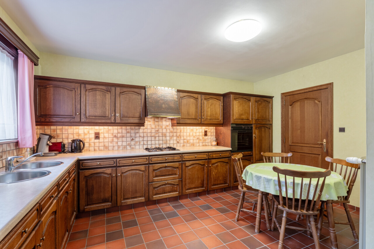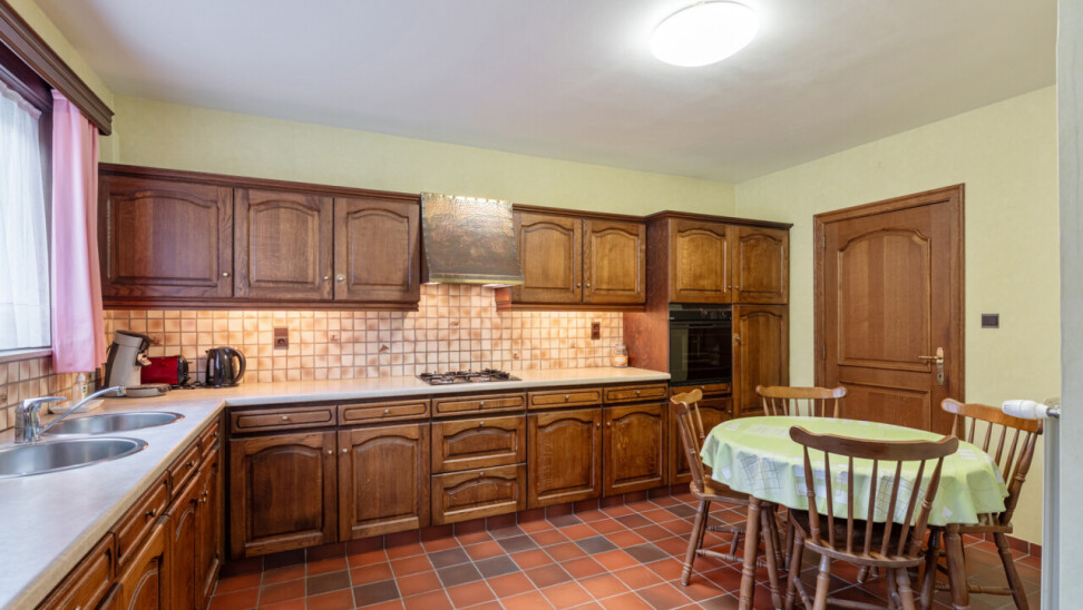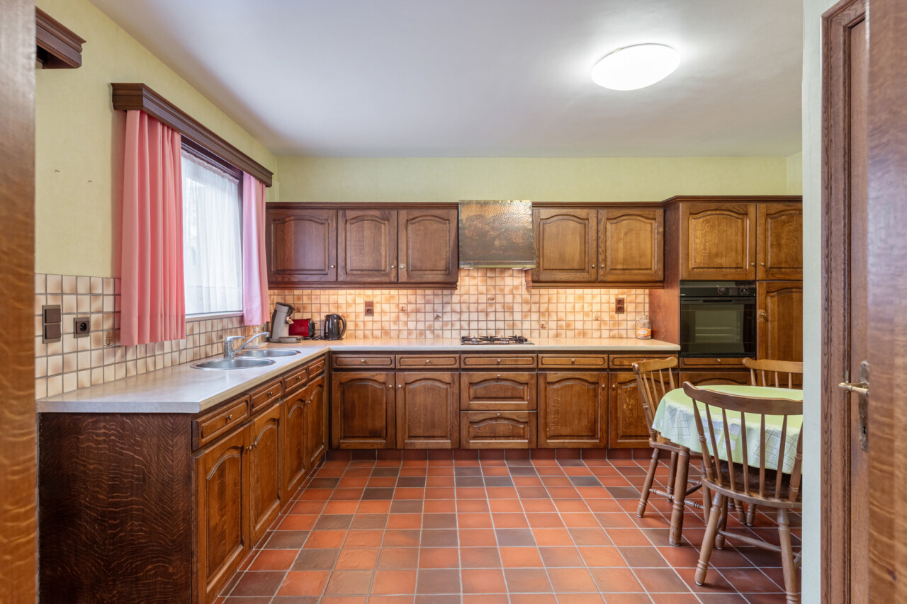 Deze gelijkvloerse woning is zeer goed onderhouden. De inkomhal omvat een apart toilet en ruimte voor een vestiaire. De lichtrijke woonkamer sluit aan op de keuken. De volledig geïnstalleerde keuken is uitgerust met een spoelbak, dampkap, koelkast en een volwaardige oven.