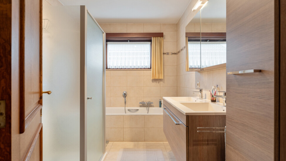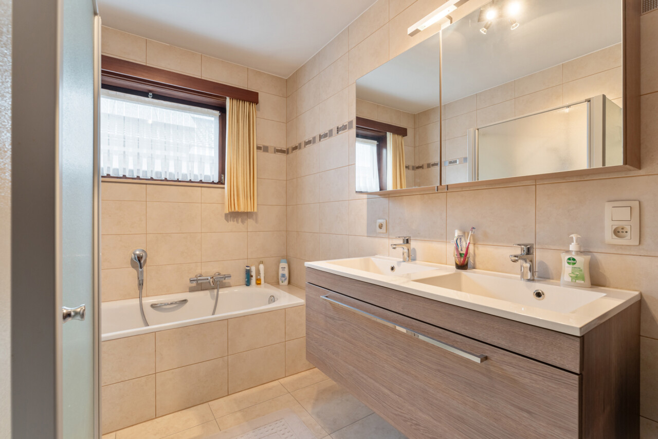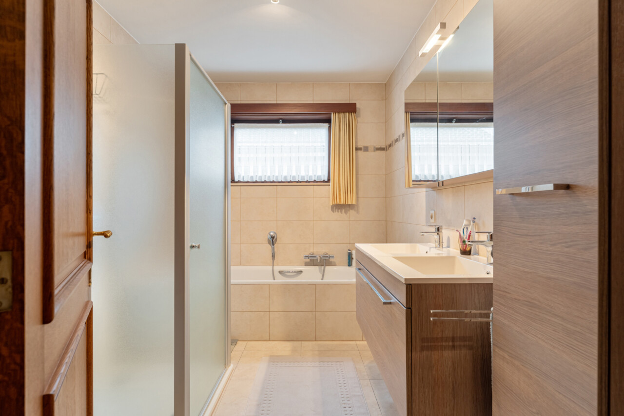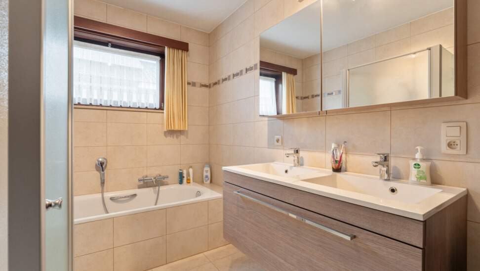 Verder beschikt de woning over drie slaapkamers en een vernieuwde badkamer. De badkamer is ingericht met een dubbele lavabo, douche, ligbad en een extra toilet. Aansluitend bevindt zich de wasplaats met ingemaakte kasten, die toegang biedt tot de tuin.
