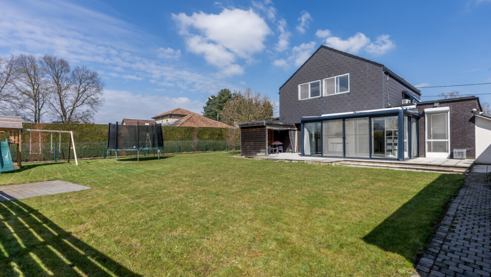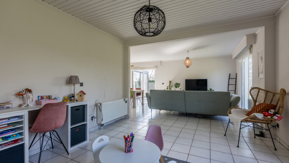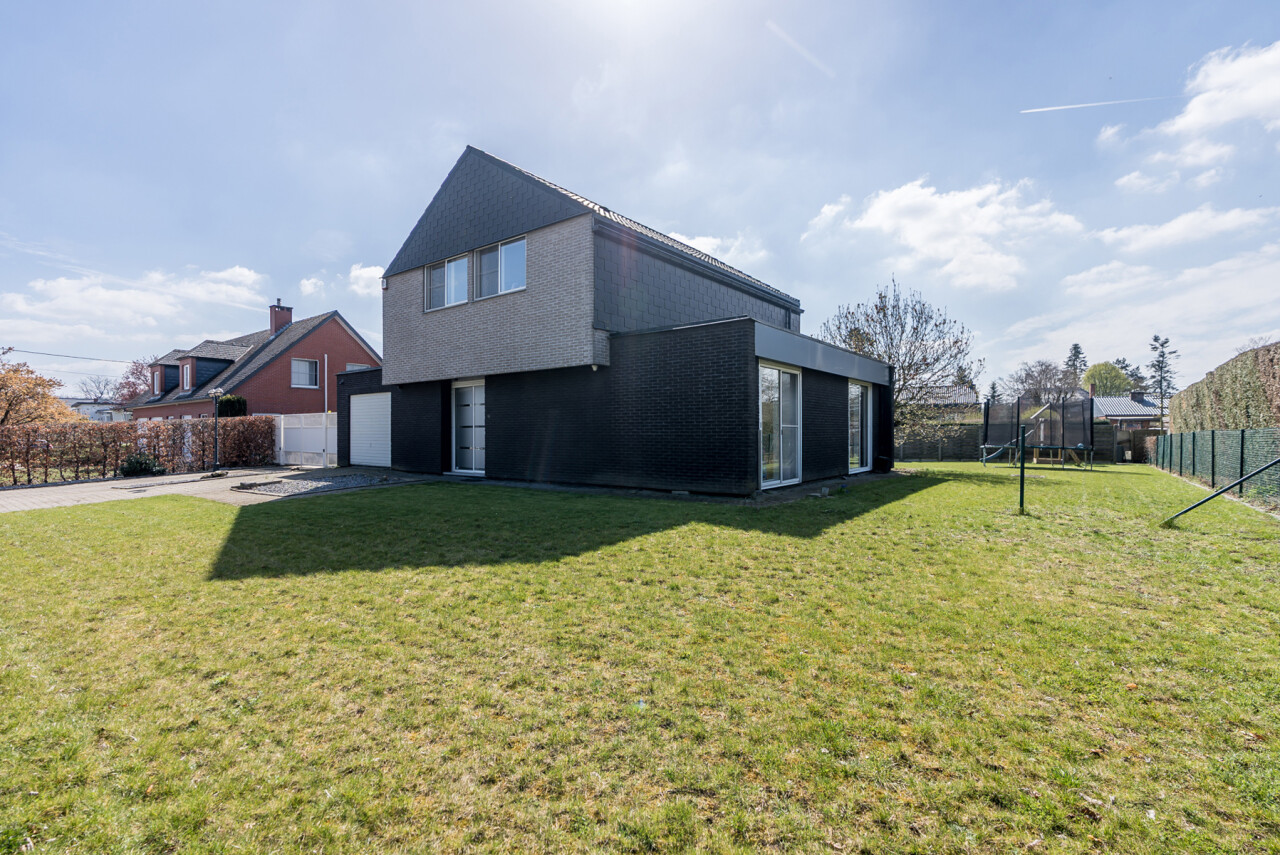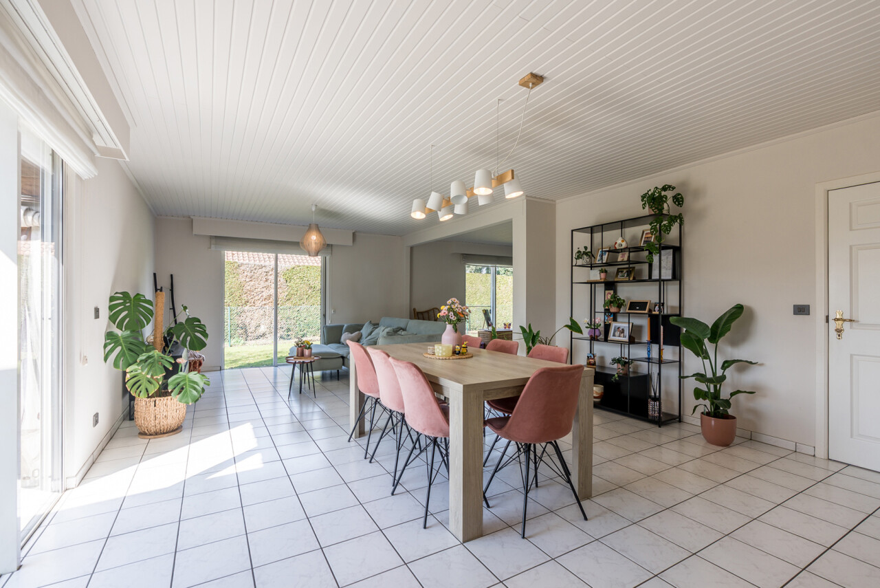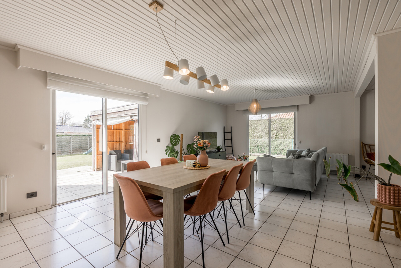 De woning beschikt over een bewoonbare oppervlakte van ± 170m² (excl. garage, kelder en zolder) en bestaat op het gelijkvloers uit een inkomhal met toilet, een ruime en lichtrijke leefruimte in L-vorm, een keuken met aansluitend bijkeuken/berging, een veranda, een badkamer met zowel een ligbad als douche en een inpandige garage. Op de verdieping hebben we 4 slaapkamers en een tweede toilet.