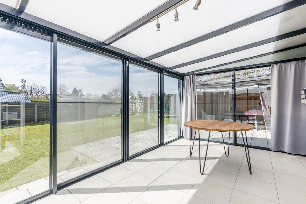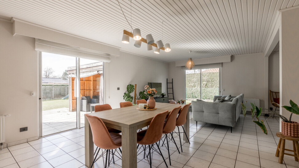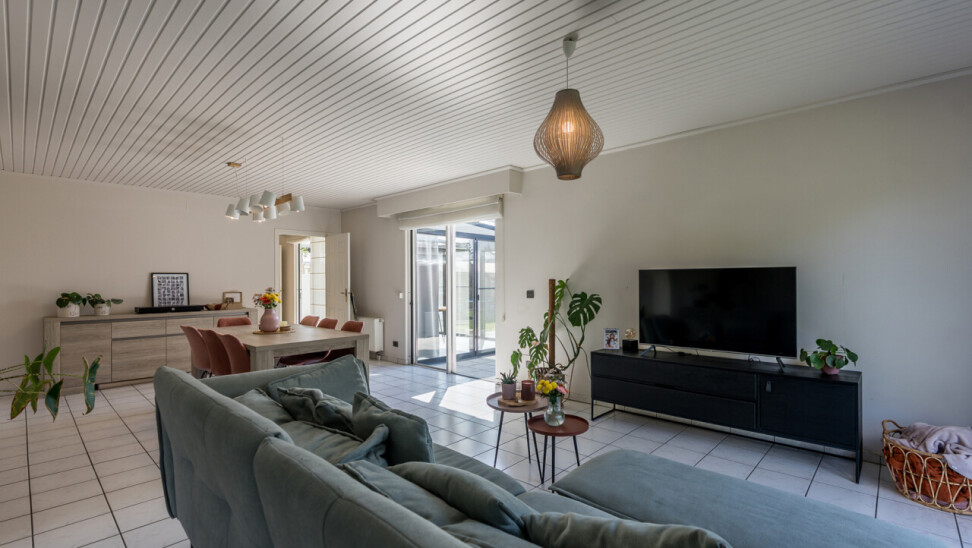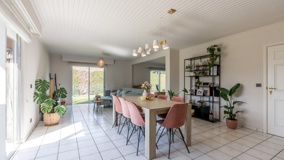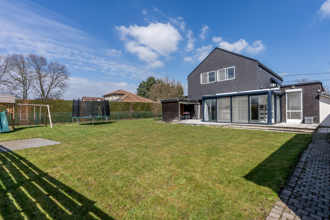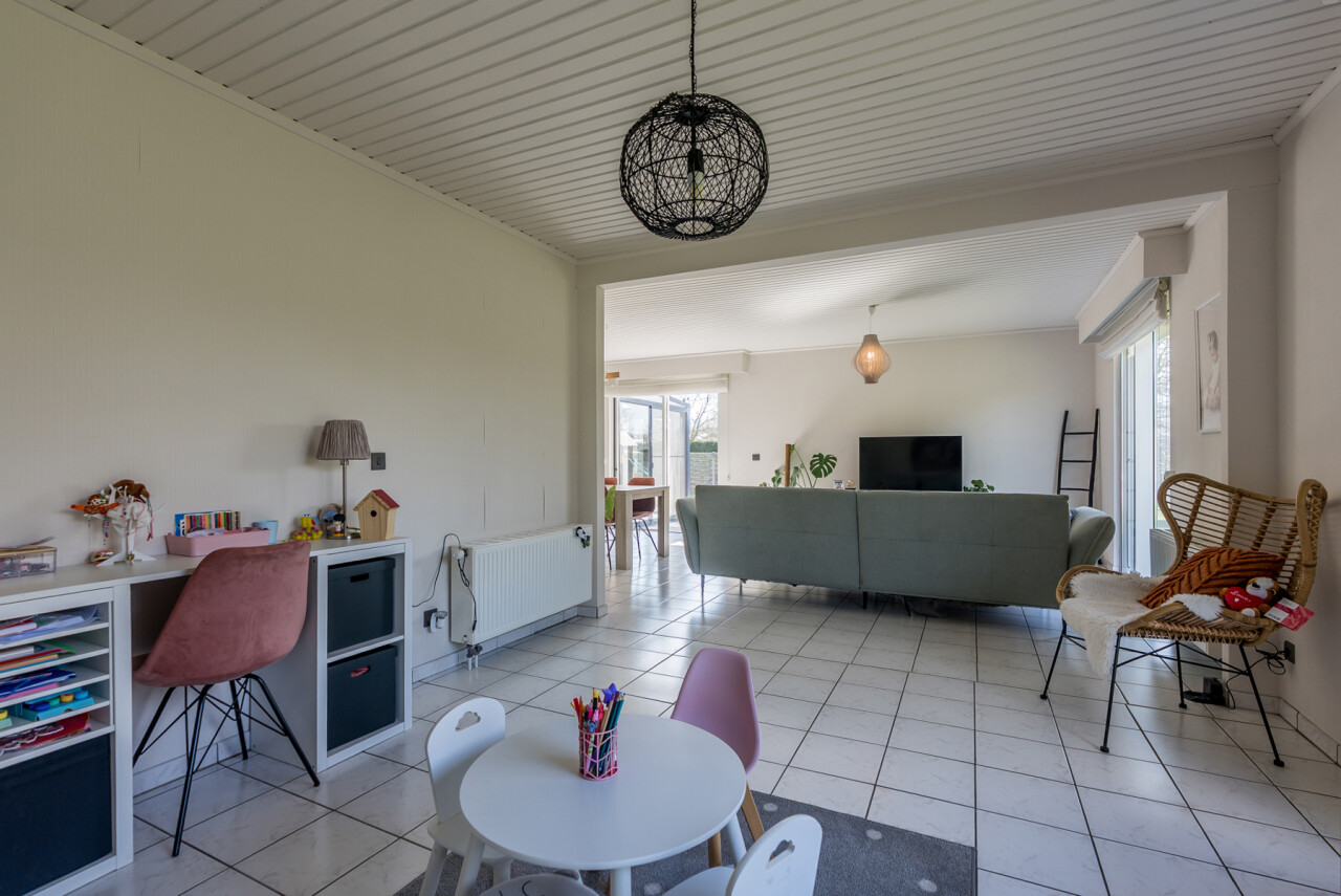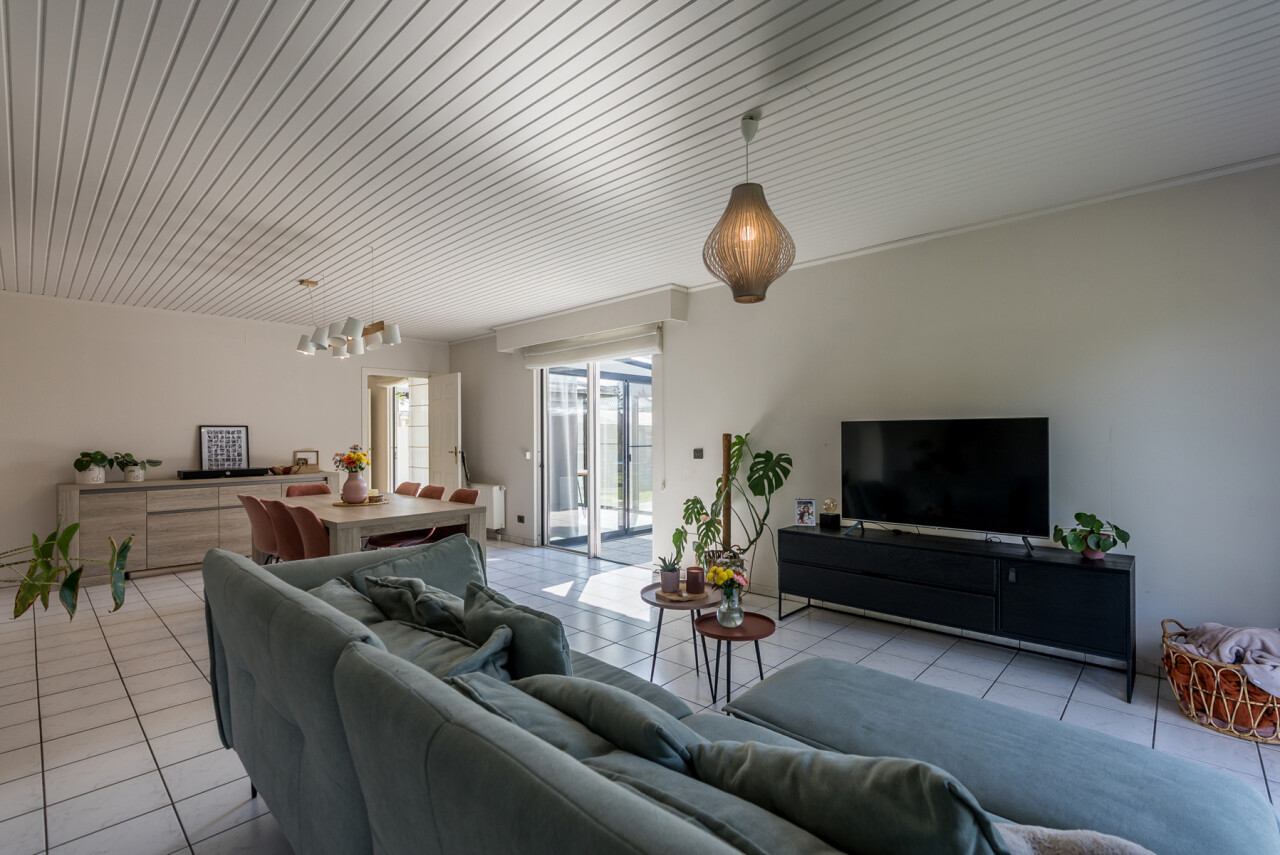 De woning beschikt over een bewoonbare oppervlakte van ± 170m² (excl. garage, kelder en zolder) en bestaat op het gelijkvloers uit een inkomhal met toilet, een ruime en lichtrijke leefruimte in L-vorm, een keuken met aansluitend bijkeuken/berging, een veranda, een badkamer met zowel een ligbad als douche en een inpandige garage. Op de verdieping hebben we 4 slaapkamers en een tweede toilet.
