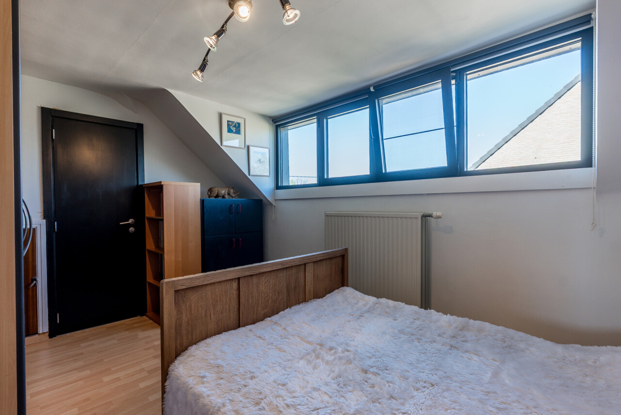 Op het gelijkvloers bestaat de woning uit een inkomhal, een lichtrijke leefruimte en moderne keuken met beide een mooi zicht op de tuin, een berging, een badkamer met lavabo, ligbad en douche, en een slaapkamer. Op de verdieping zijn er nog 2 slaapkamers en enkele zolderkamers die kunnen dienen voor opslag. Verder is er nog een kelder van ± 15m².