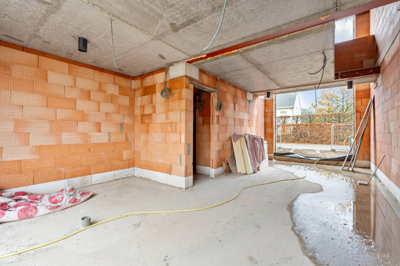 Het gelijkvloers omvat een inkomhal met apart toilet en vestaire. De leefruimte met open trap geniet van veel lichtinval en geeft directe toegang tot de keuken. Vanuit beide ruimtes is er zicht op de tuin.