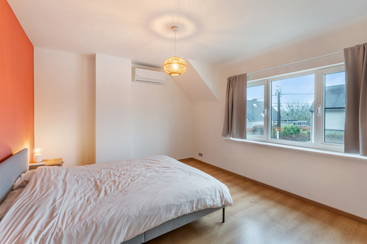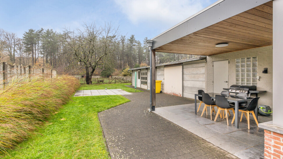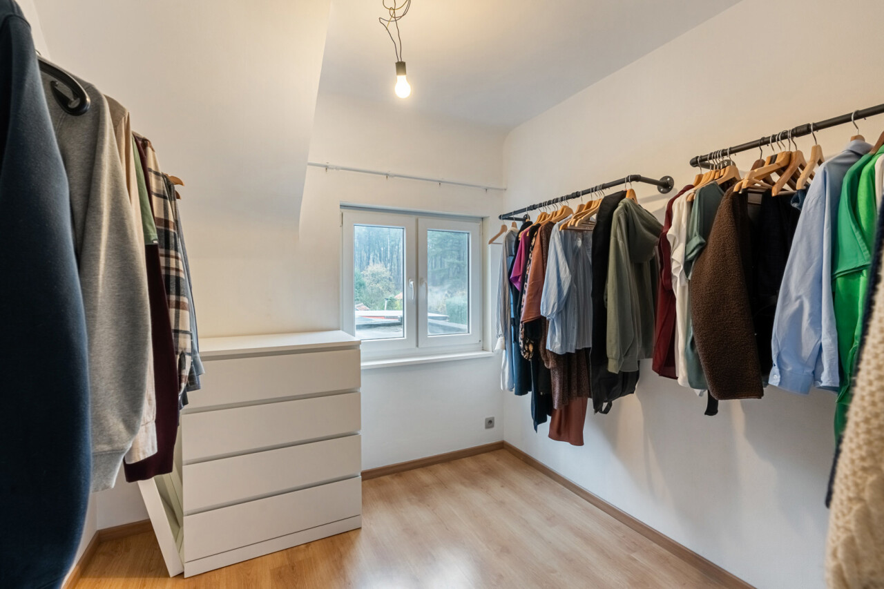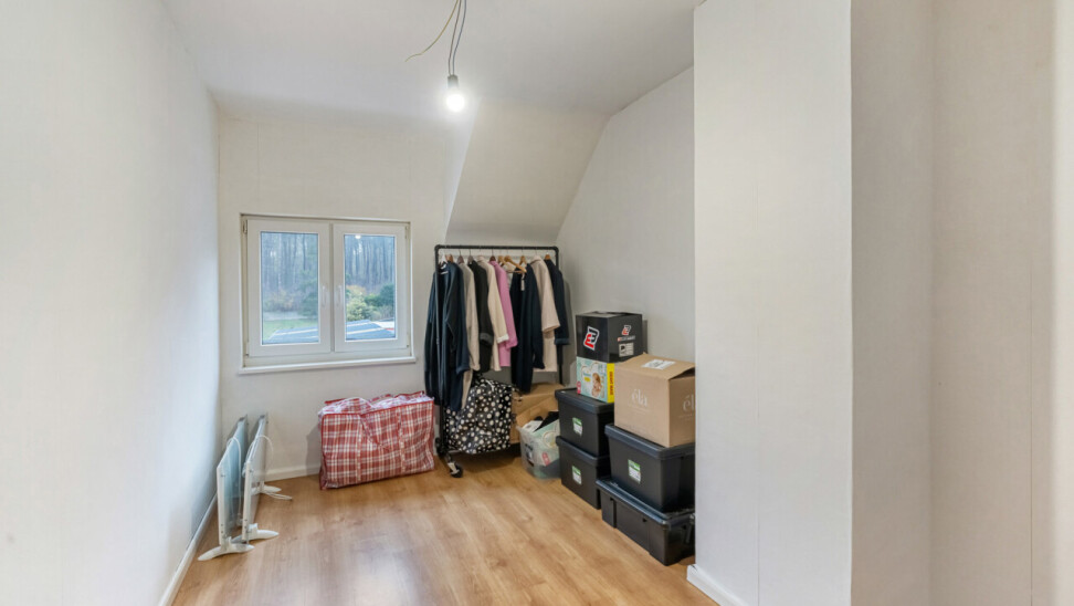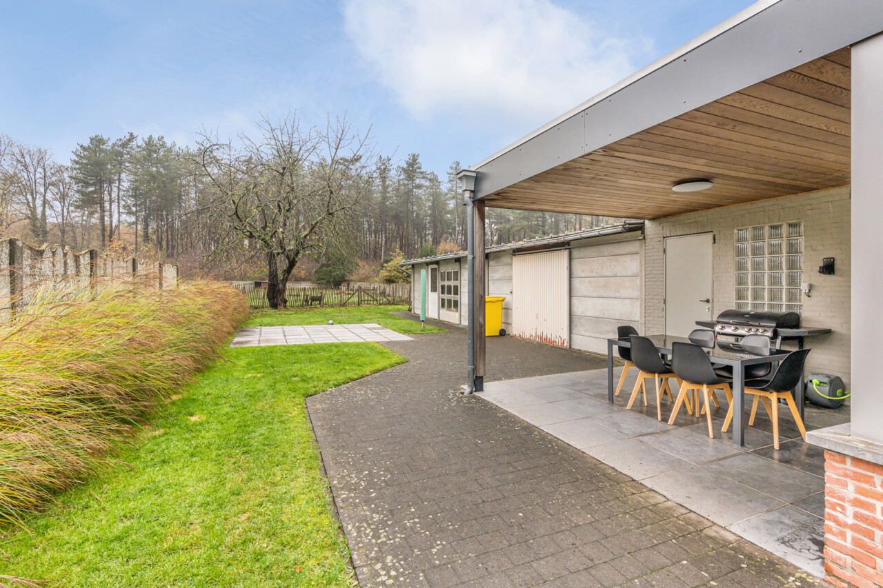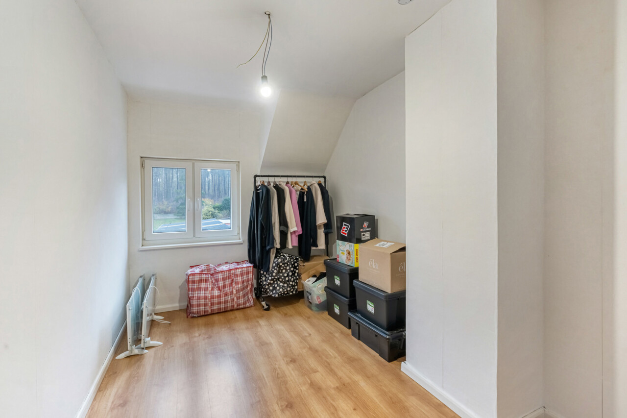 Op de eerste verdieping bevinden zich drie slaapkamers. De zolderruimte is bereikbaar via een luik en biedt extra opbergmogelijkheden. Buiten geniet u van een onderhoudsvriendelijke tuin die achteraan grenst aan het bos. Daarnaast beschikt het perceel over een ruime werkplaats/motor-garage van ca. 50m² én een carport.