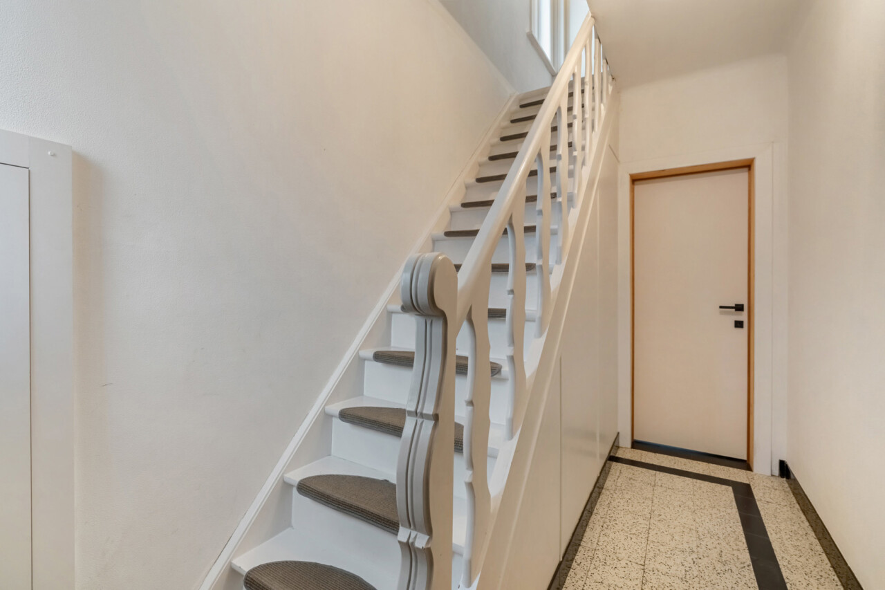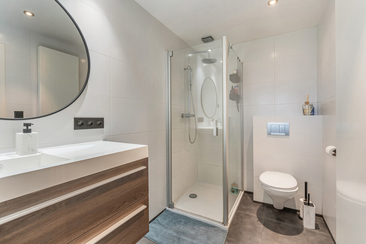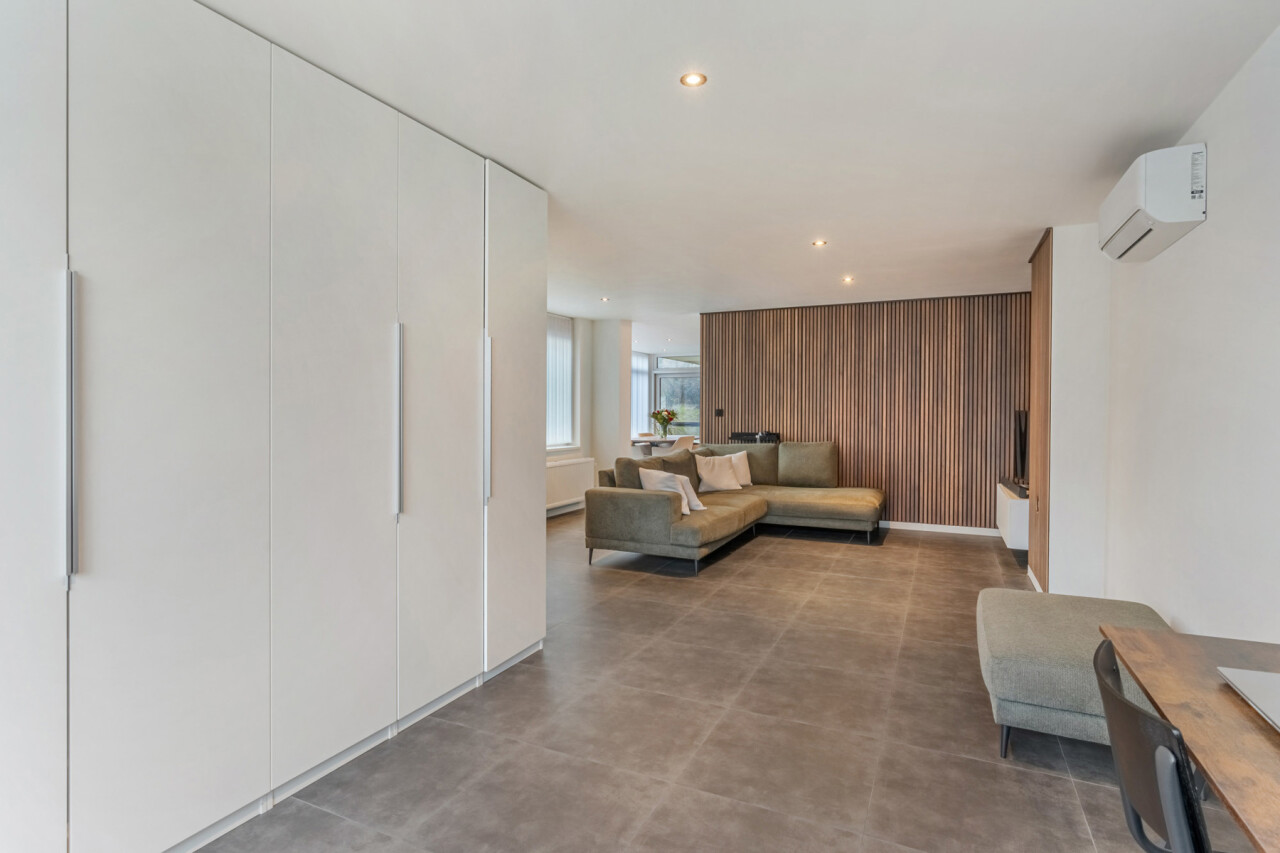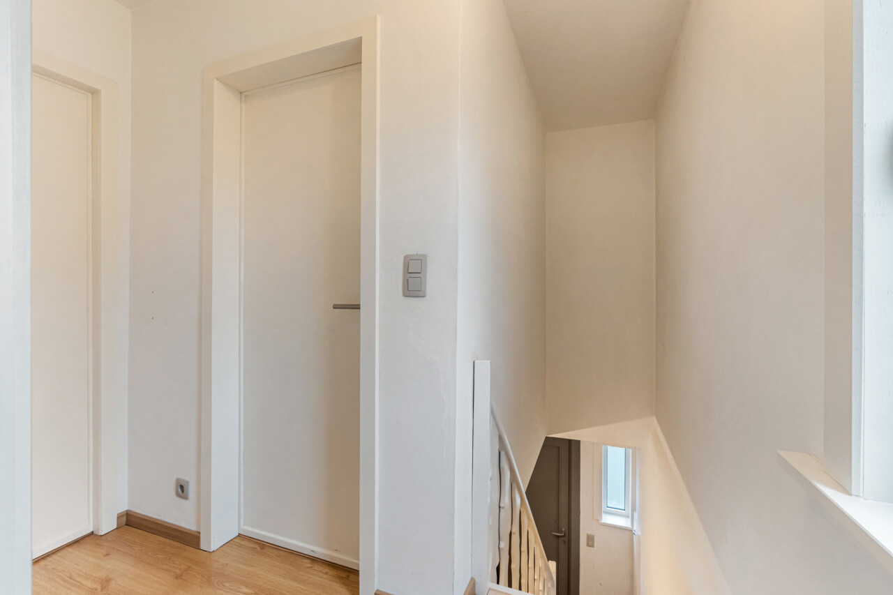 Op de eerste verdieping bevinden zich drie slaapkamers. De zolderruimte is bereikbaar via een luik en biedt extra opbergmogelijkheden. Buiten geniet u van een onderhoudsvriendelijke tuin die achteraan grenst aan het bos. Daarnaast beschikt het perceel over een ruime werkplaats/motor-garage van ca. 50m² én een carport.