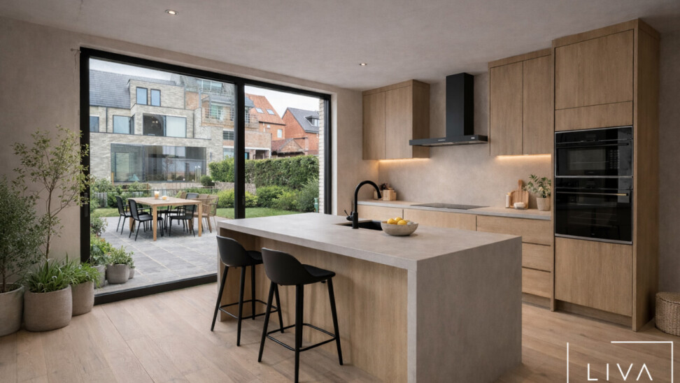 Het gelijkvloers omvat een inkomhal met apart toilet en vestaire. De leefruimte met open trap geniet van veel lichtinval en geeft directe toegang tot de keuken. Vanuit beide ruimtes is er zicht op de tuin.