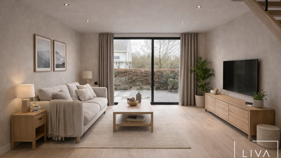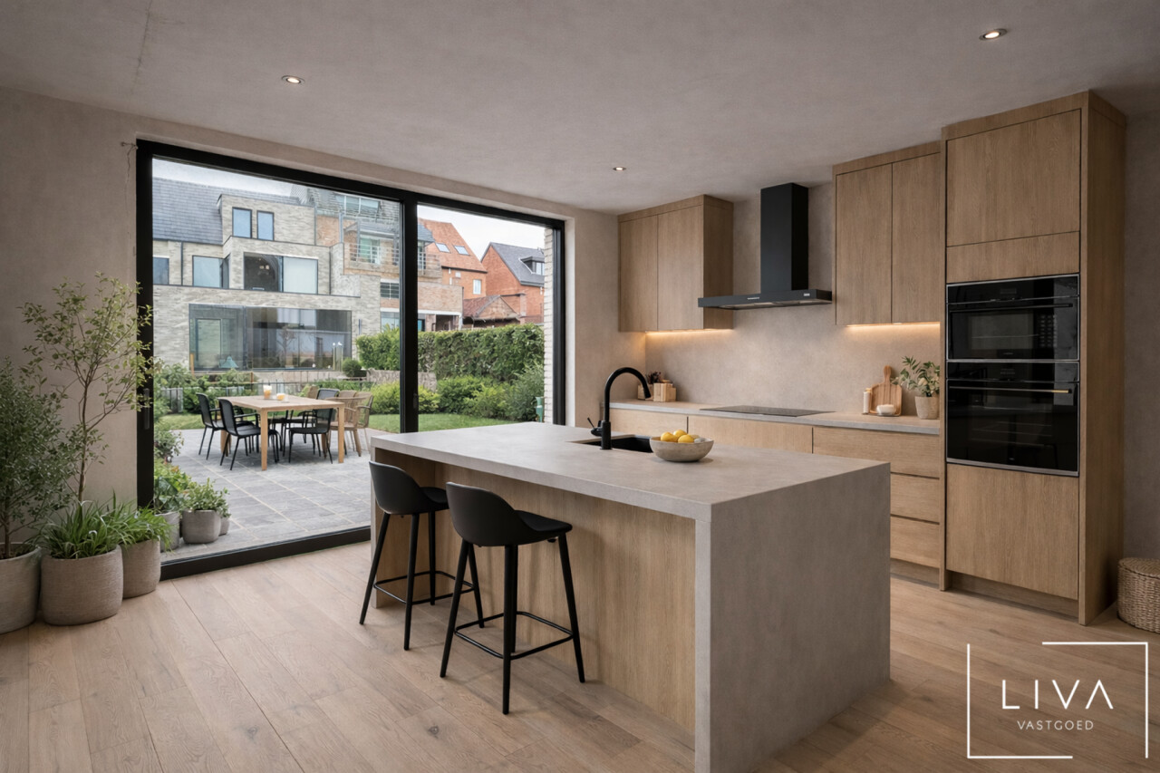 Het gelijkvloers omvat een inkomhal met apart toilet en vestaire. De leefruimte met open trap geniet van veel lichtinval en geeft directe toegang tot de keuken. Vanuit beide ruimtes is er zicht op de tuin.