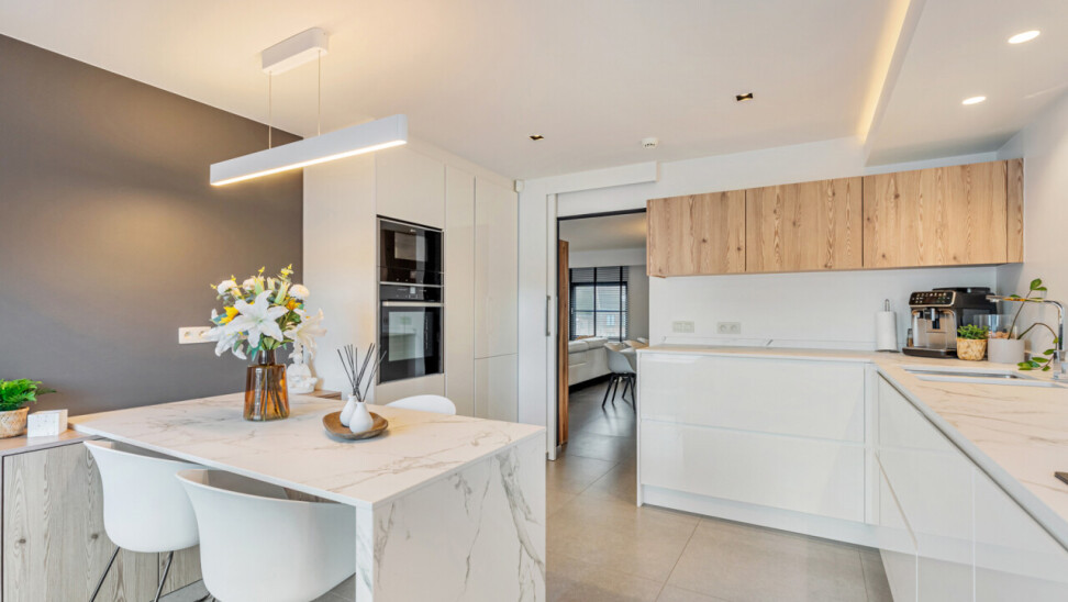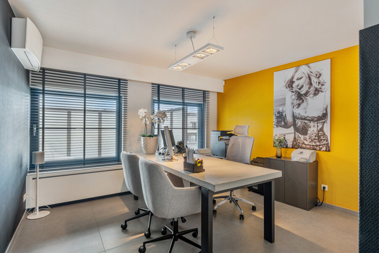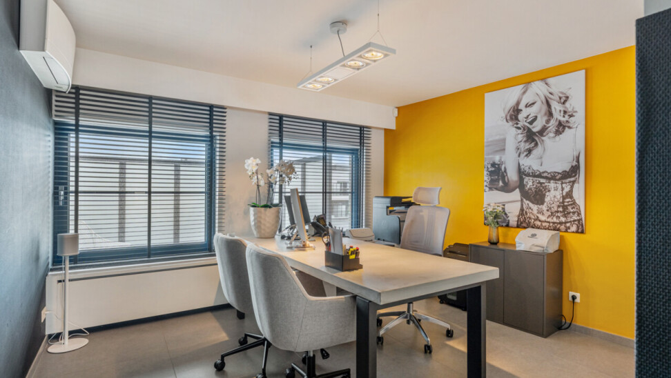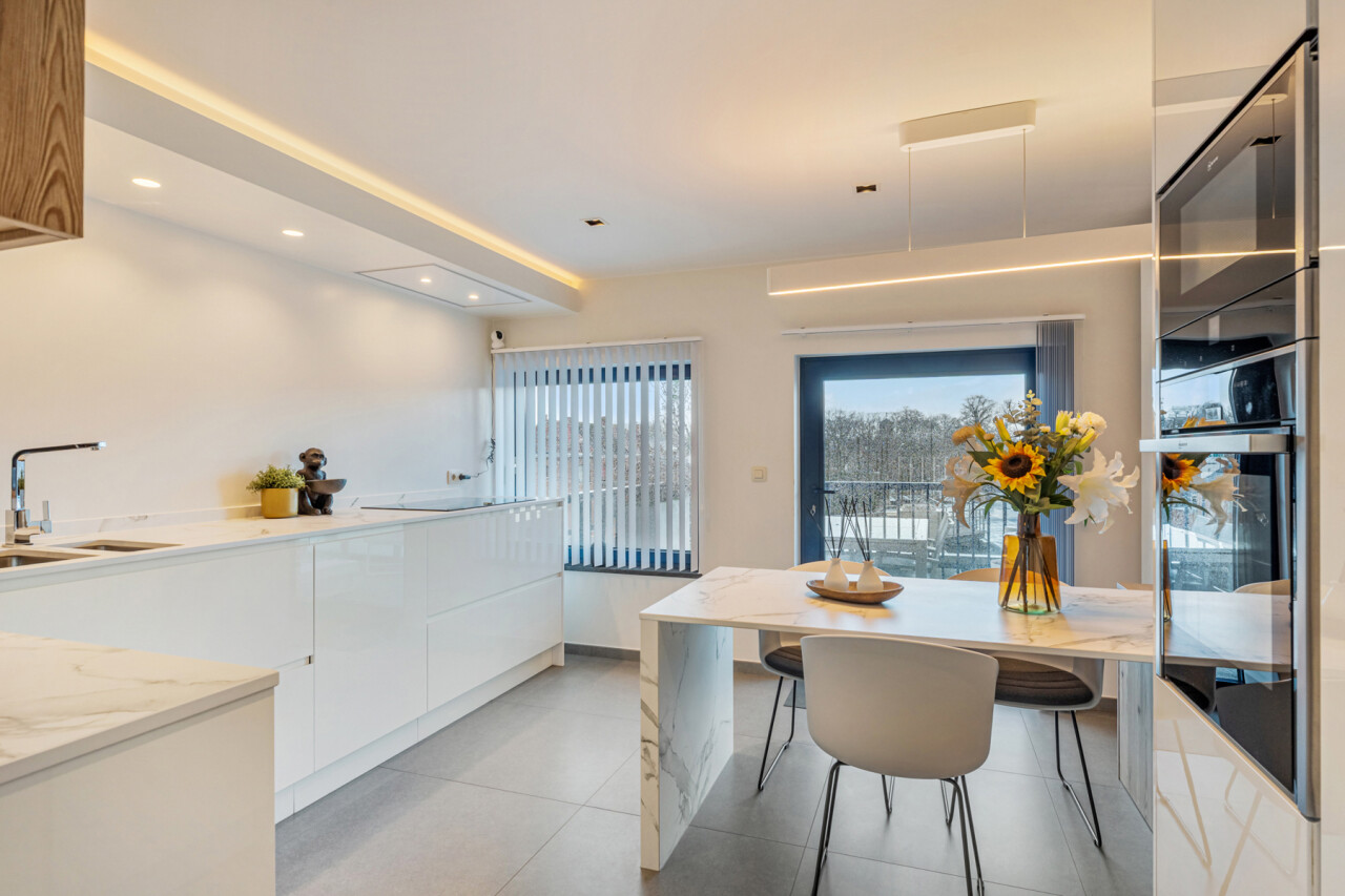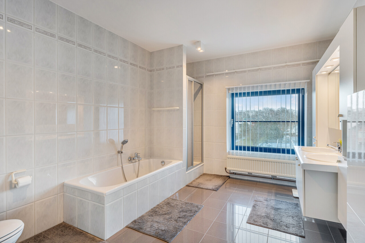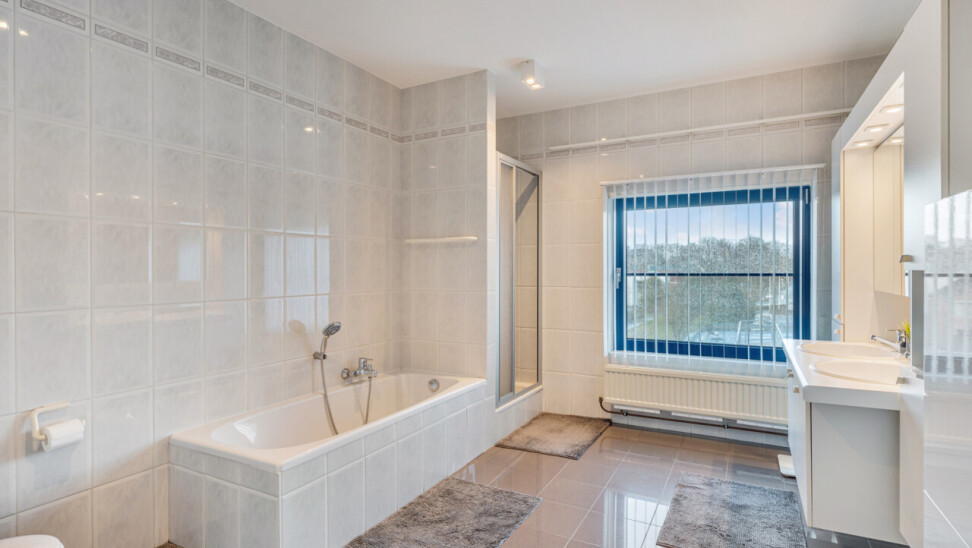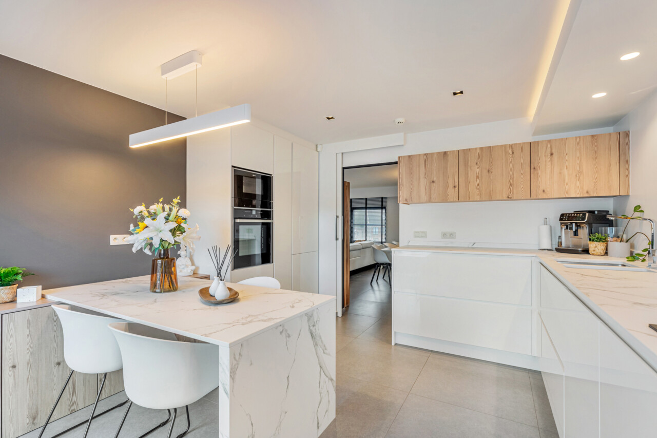 Via de inkomhal, inclusief een aparte bergruimte, bereiken we de tweede verdieping. Deze verdieping beschikt over een inkomhal met apart toilet, een ruime woonkamer en een kantoorruimte. De volledig uitgeruste keuken, afgewerkt met hoogwaardige materialen, biedt toegang tot het terras. Daarnaast is er op deze verdieping nog een badkamer met tweede toilet, douche, dubbele wastafel en een ligbad.